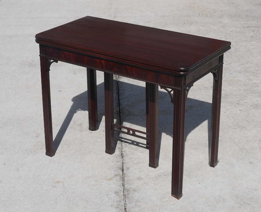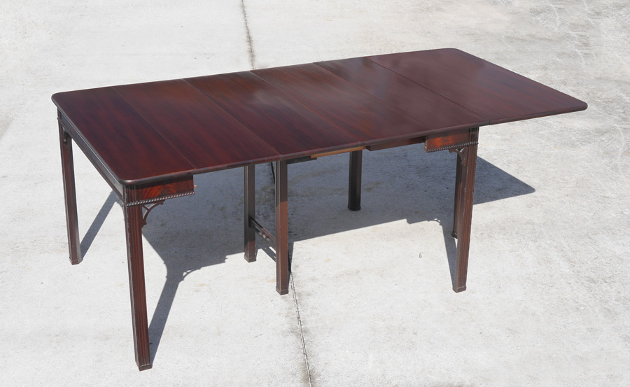 MAHOGANY FLIP TOP FOYER / DINING TABLE: Chippendale style foyer table which converts to a dining table with a flip of the top and the addition of the three 12'' leaves. Skirt with rope twist border, fluted primary legs, overall closed measures 30 1/2'' h. x 39'' x 20 1/4''.