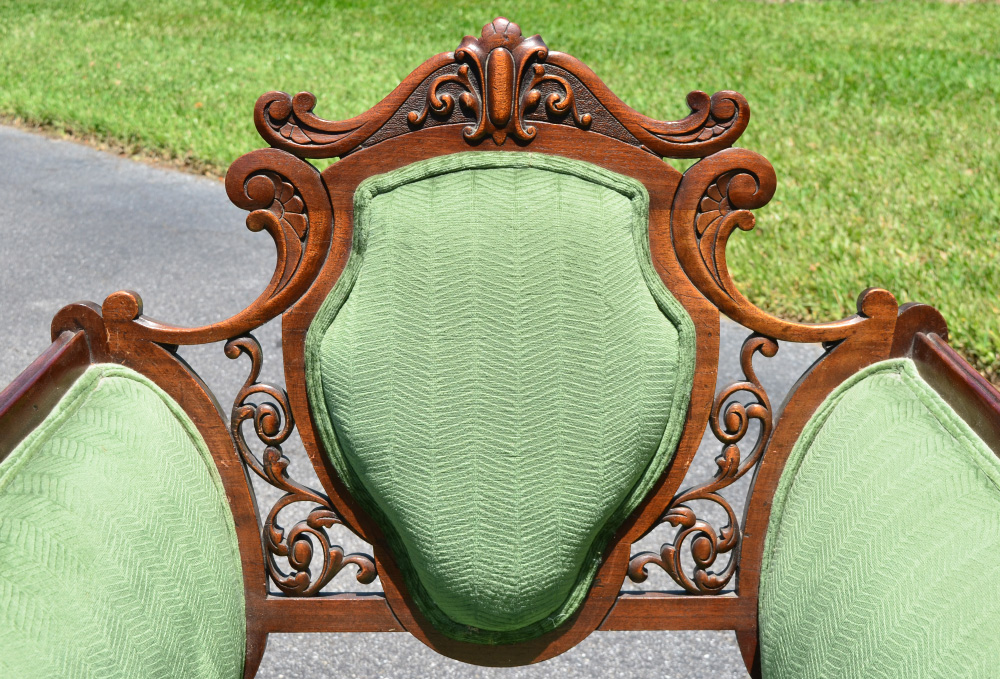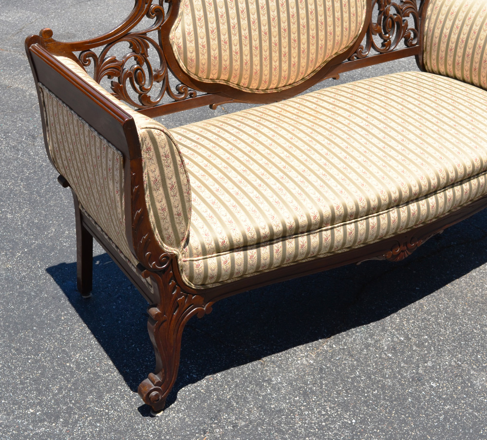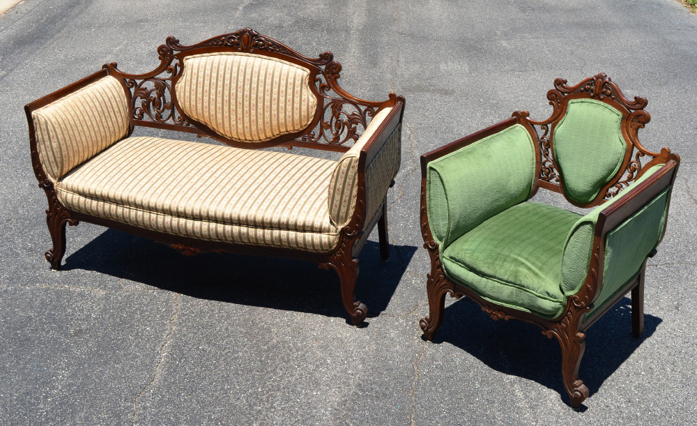 VICTORIAN CARVED SETTEE AND CHAIR: Matching frames with non-matching upholstery to include 1) Settee with carved and open work back with foliate scroll motifs, shaped arms, carved and shaped crest, striped floral pattern upholstery. 39 1/2'' h. x 57'' x 23''. 2) Matching frame arm chair with patterned green upholstery. 39 1/2'' h. x 28 1/4'' x 25''.