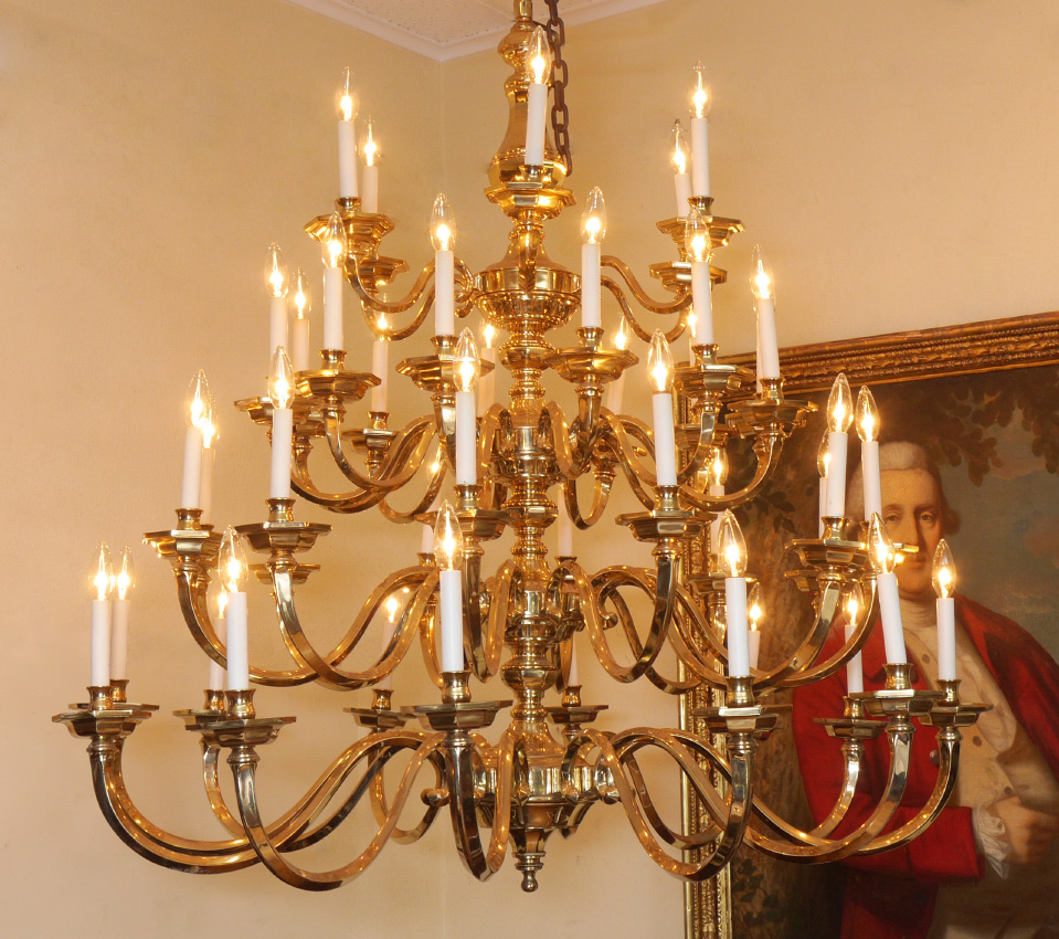 PALATIAL 42 LIGHT BRASS CHANDELIER: 42 arms on 4 tiers, brass body, fit for a stately home. Approx. 51'' h. x 58'' excluding the chain.