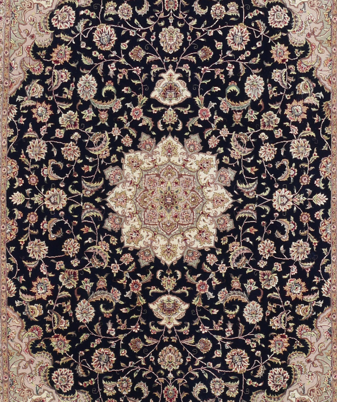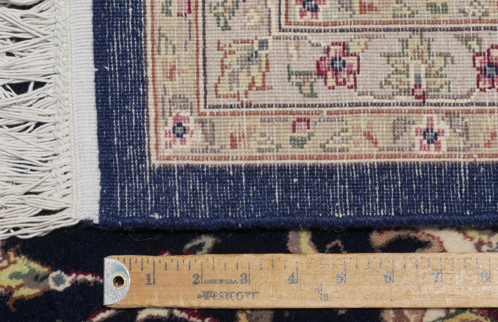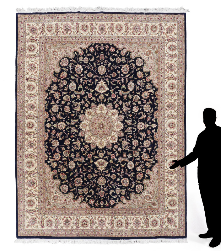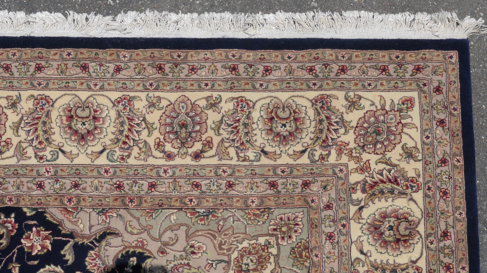 APPROX. 15-25 YR. OLD INDO-PERSIAN HAND KNOTTED WOOL RUG, 8'2'' x 10'1'': This rug has a traditional Persian curvilinear city design that includes a round pastel colored central medallion with matching pastel corners of the field. The rest of the deep blue field is covered with small floral leaf and vine motifs. The borders of the rug are a continuation of the pastel colors found in the decorations, medallion, and corners. A well balanced and attractive rug. Condition is good.