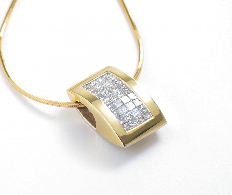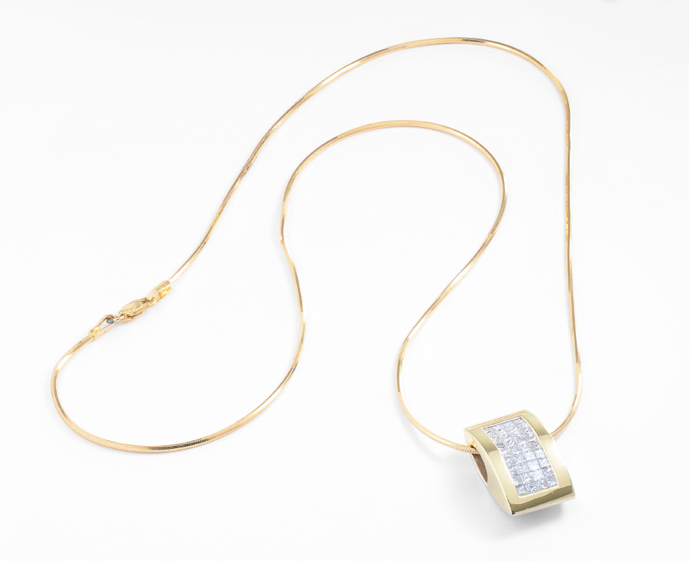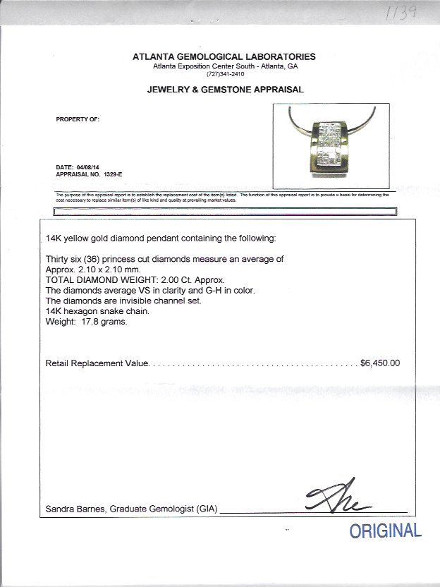 MILOR ITALIAN DIAMOND PENDANT NECKLACE: 14K yellow gold chain and pendant. The pendent set with 36 princess cut, invisible channel set diamonds totaling approx. 2.00 Ct., average VS clarity and G-H color. The hexagon snake chain is 20'' length. The pendant .75'', Weight oveall 17.8 grams. Sold with 2014 Atlanta Gemological GIA graduate's appraisal for $6450.