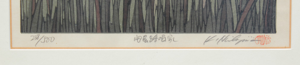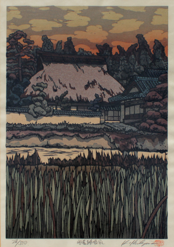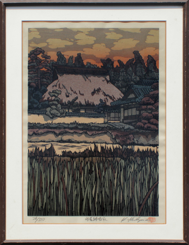 NISHIJIMA, Katsuyuki, (Japanese, 1945- ): Village Scene Across the River, Japanese Woodblock Print, sight size 17'' x 12'', pencil signed lower right, numbered 238 of 500 lower left, original frame, 20 1/2'' x 16 1/4''.
