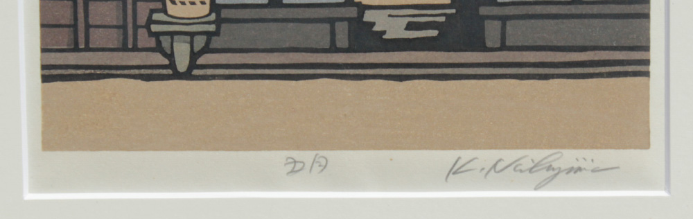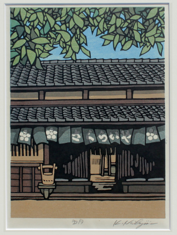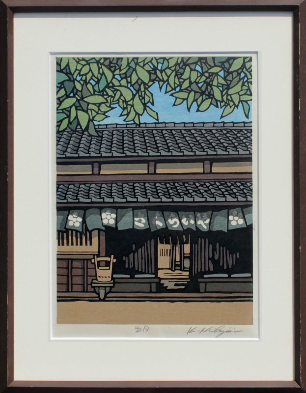 NISHIJIMA, Katsuyuki, (Japanese, 1945- ): Residence Through the Trees, Japanese Woodblock Print, sight size 11 1/4'' x 8'', original frame, 16'' x 12 1/4'', pencil signed lower right.
