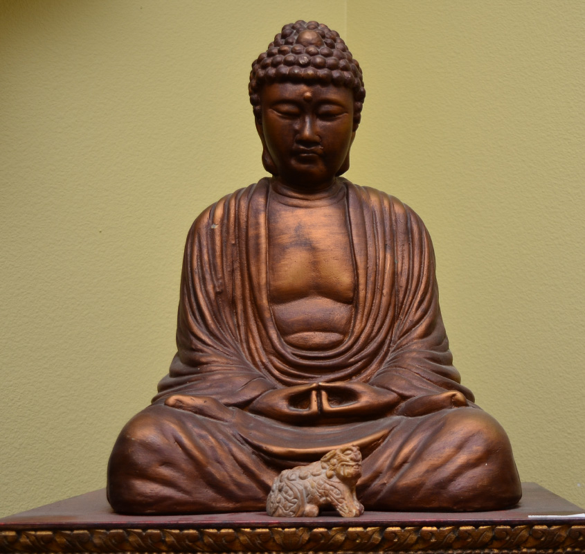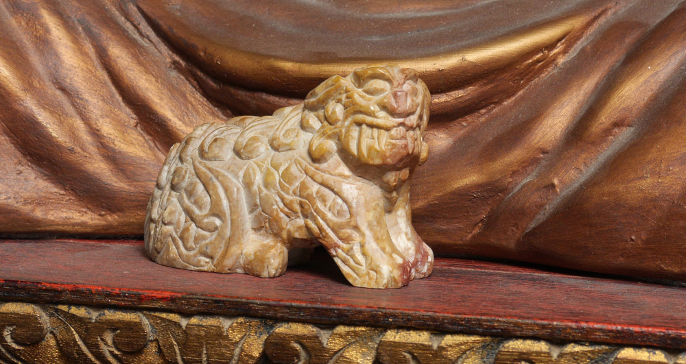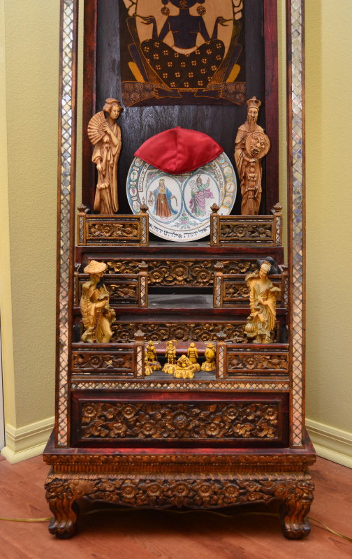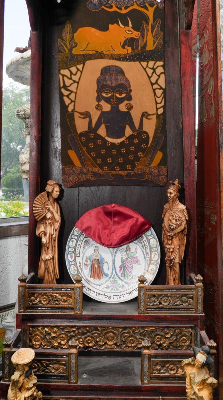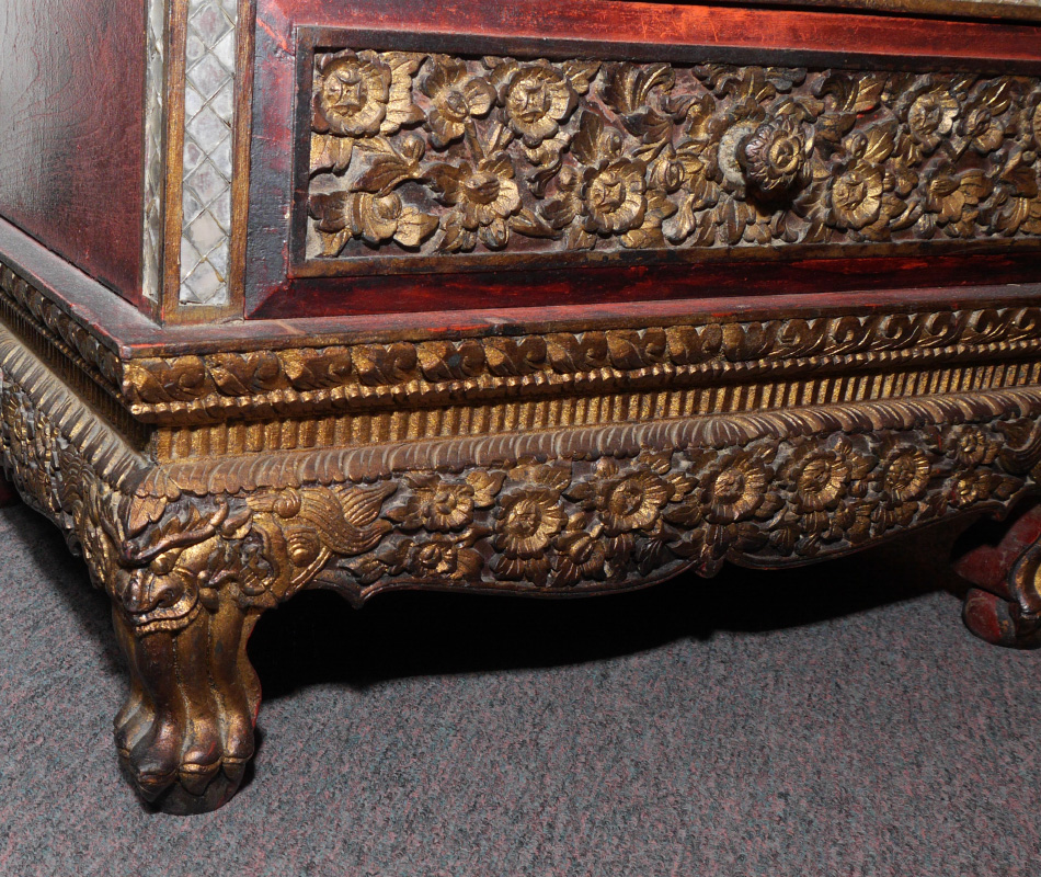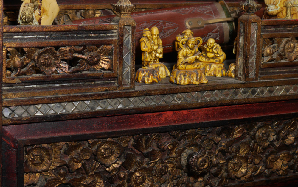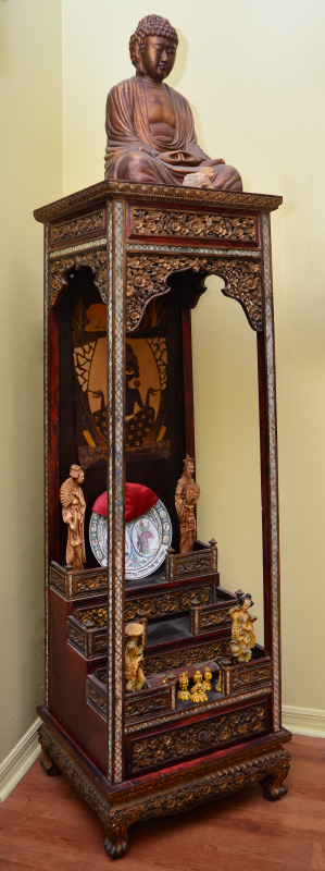 BUDDHIST TEMPLE WITH SEATED BUDDHA: Thailand Buddhist altar / temple, with carved, pierced and gilt floral panels and decoration. Applied mirrored trim, base with 3 stepped levels over single drawer. Sold with an assortment of oriental items and decorations with the largest being a seated earthenware Buddha, 18'' h. x 13 1/2'' x 9''. Shrine overall measures 63'' h. x 22'' x 19''.