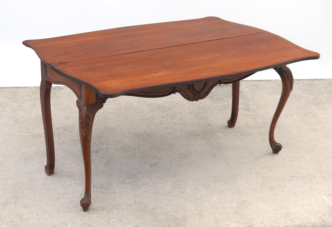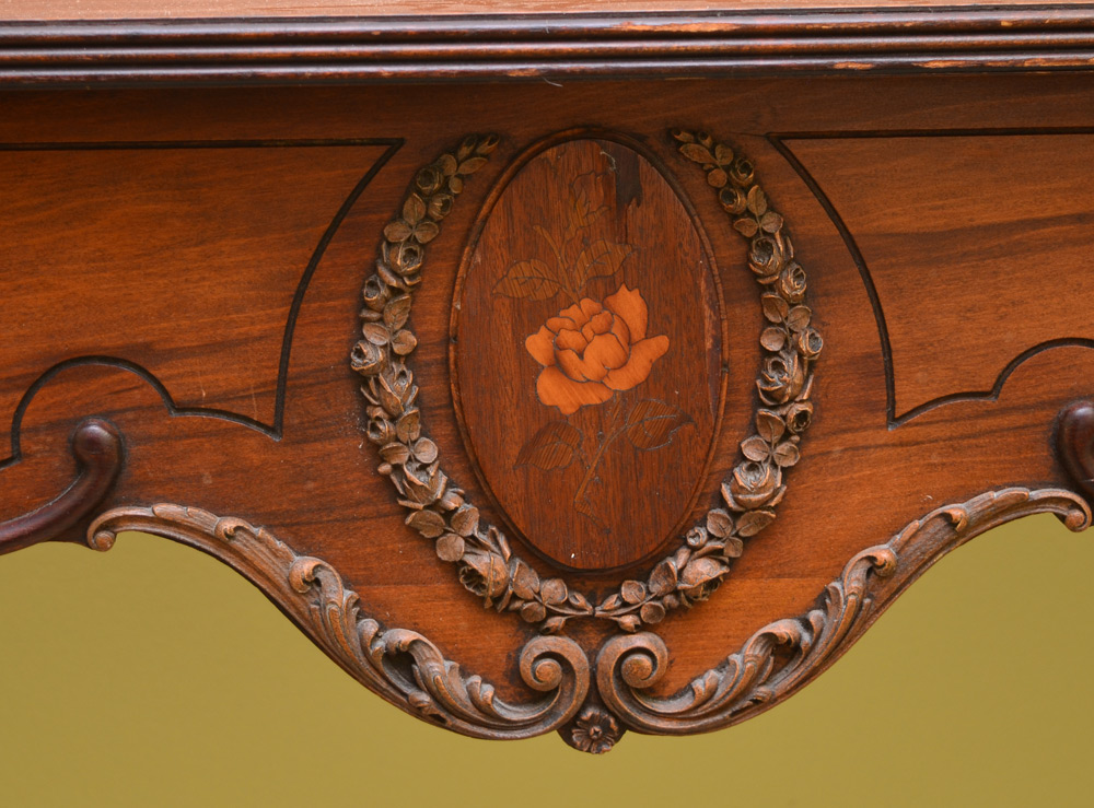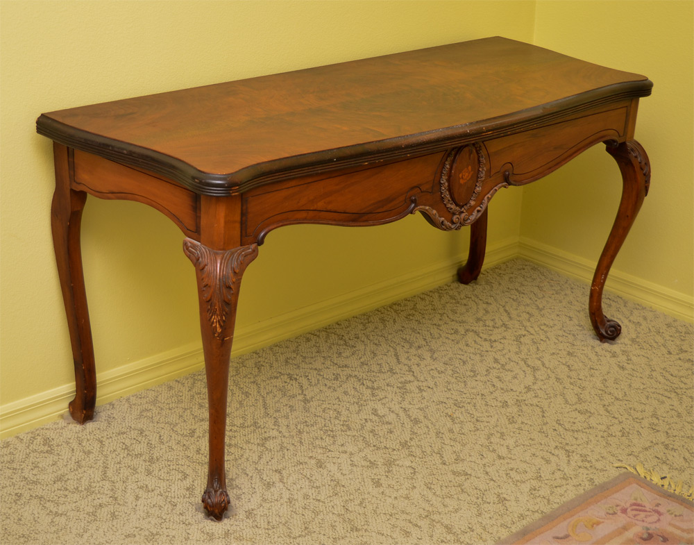 CARVED MAHOGANY FOYER / DINING TABLE: Shaped mahogany top slides and flips to convert to dining table, carved front skirt with rose inlay medallion. Carved and shaped front legs, small hidden storage area under top, overall measures 30 1/4'' h. x 59 3/4'', 42'' dining, 21'' foyer.
