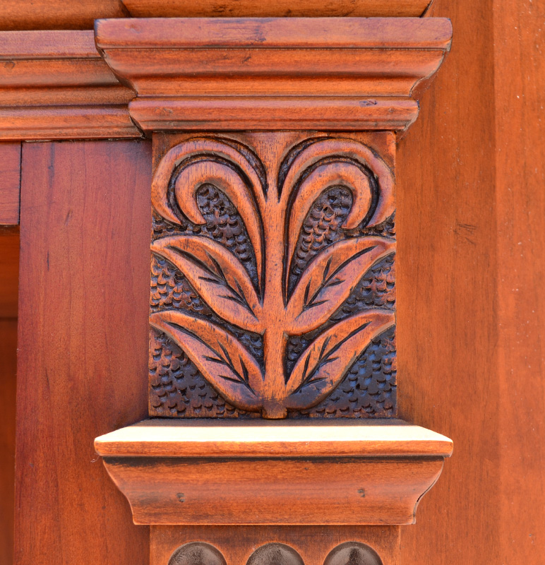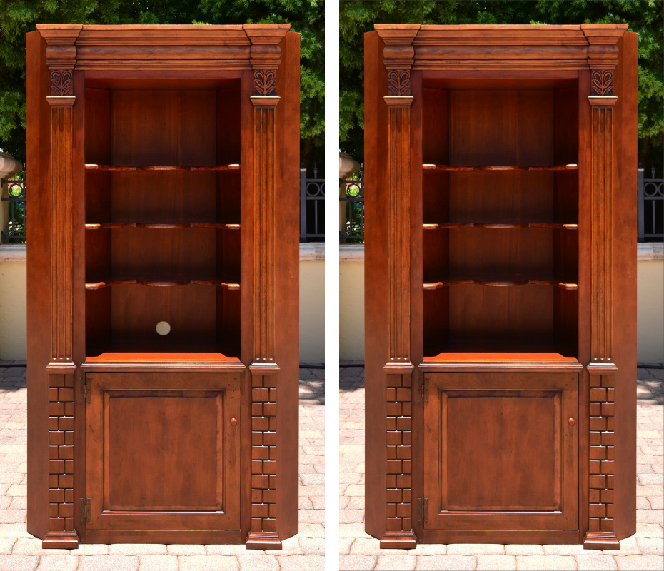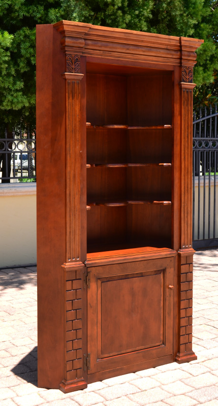 PAIR OF CORNER DISPLAY CABINETS: 2 identical cabinets, architectural pediment over open display with 3 shaped shelves, carved and fluted stiles with foliate and brick decoration. Blind lower door with single shelf, each overall 83'' h. x 47 1/2'' x 20 1/4''.