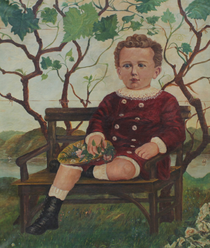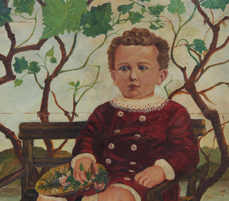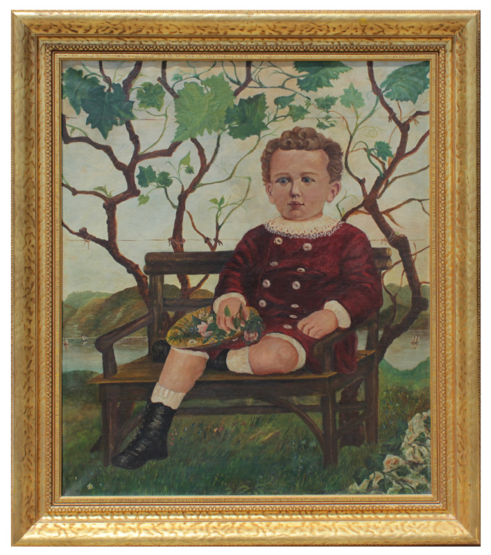 FOLK PORTRAIT PAINTING WITH YOUNG CHILD IN A VINEYARD: Oil/Canvas, 34'' x 29'', no visible signature, gilded frame, 42'' x 37''.