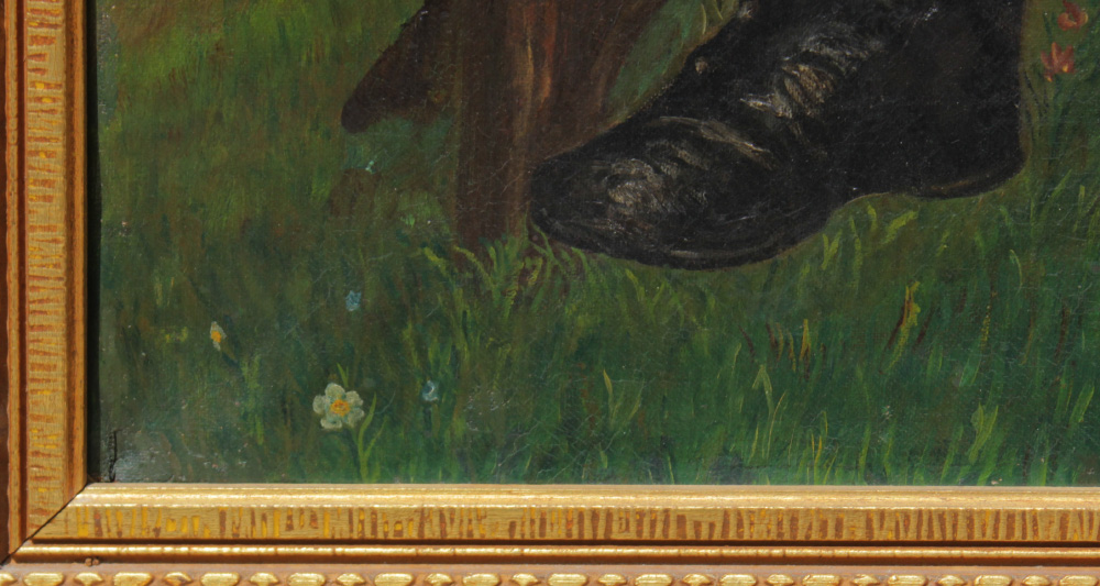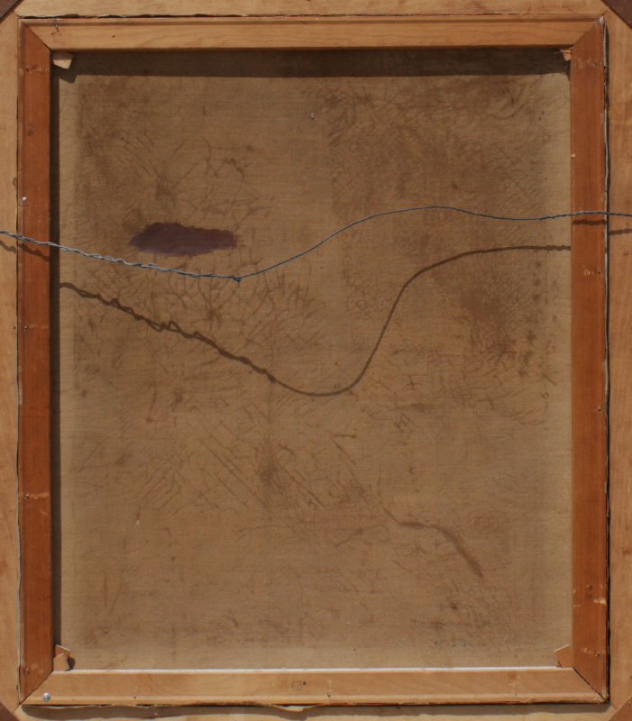 CONDITION: Craquelure throughout, needs cleaning, several repairs to tears, minor touch-up, and several flecks of paint loss. Sold as is.
