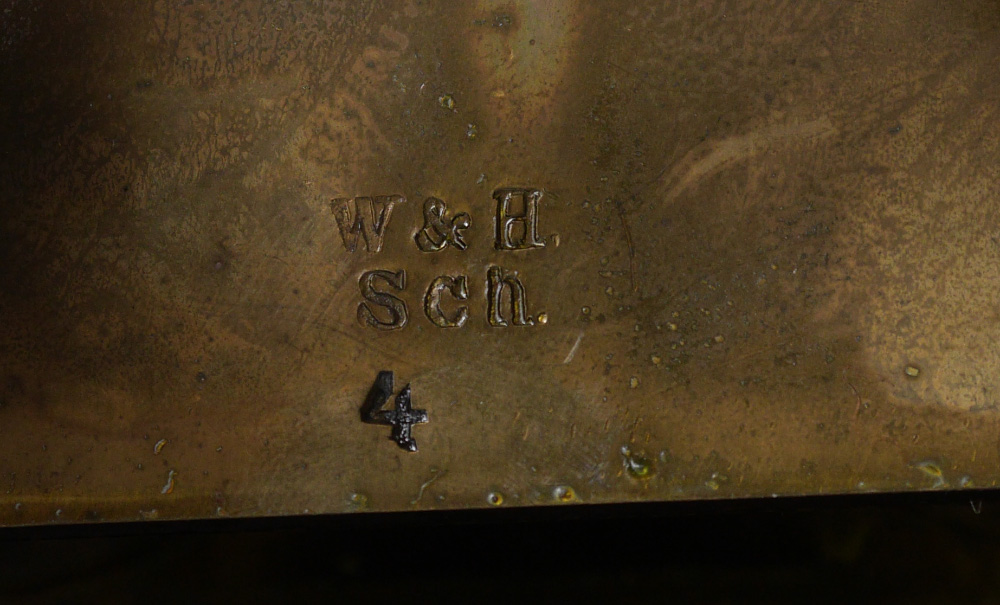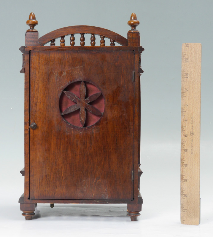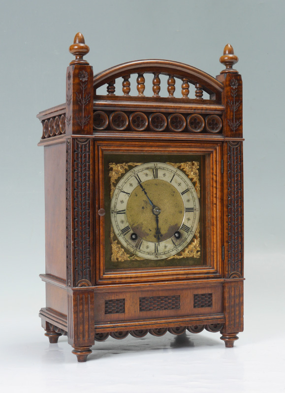 WINTERHALDER & HOFMEIER CARVED MANTLE CLOCK: Mahogany case with carved architectural facade, arched pediment with gallery, 2 spire finials over applied decoration, carved stiles, lower applied decoration, all on 4 feet. Mixed metal dial with applied ormolu decoration at corners, Roman and Arabic numerals on silvered chapter ring. Time and gong strike movement marked W&F Sch. Overall measures 15'' h. x 9'' x 6 1/2''.