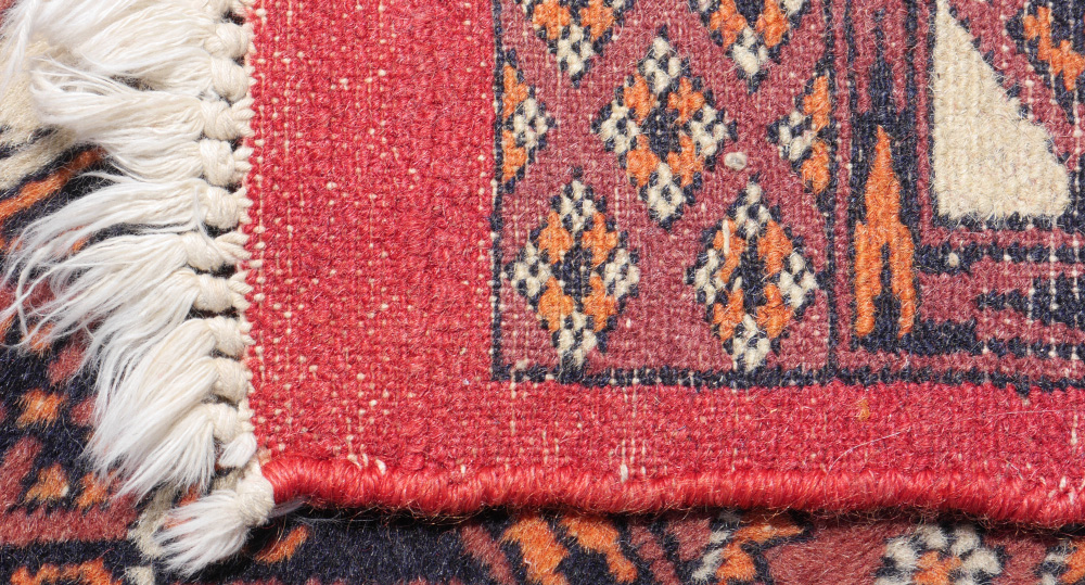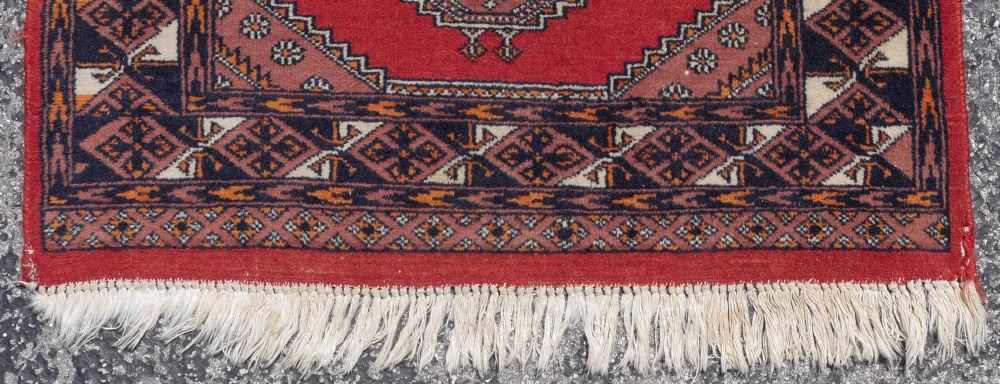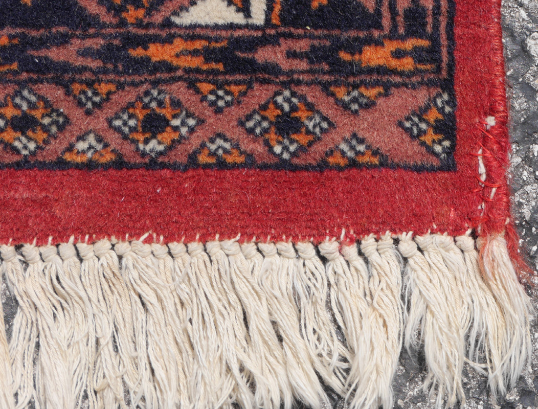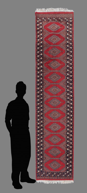 APPROX. 20-30 YR. OLD PAKISTANI BOKHARA HAND KNOTTED WOOL RUG, 2'7'' x 10'1'': This runner has panels created by half ''guls'' on either side linked by lines across the red field. In the center of each panel is a diamond shaped ''gul''. The main border has an interesting black and white checkerboard ground with small diamond shaped ''guls''. Condition is good.