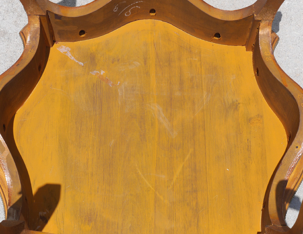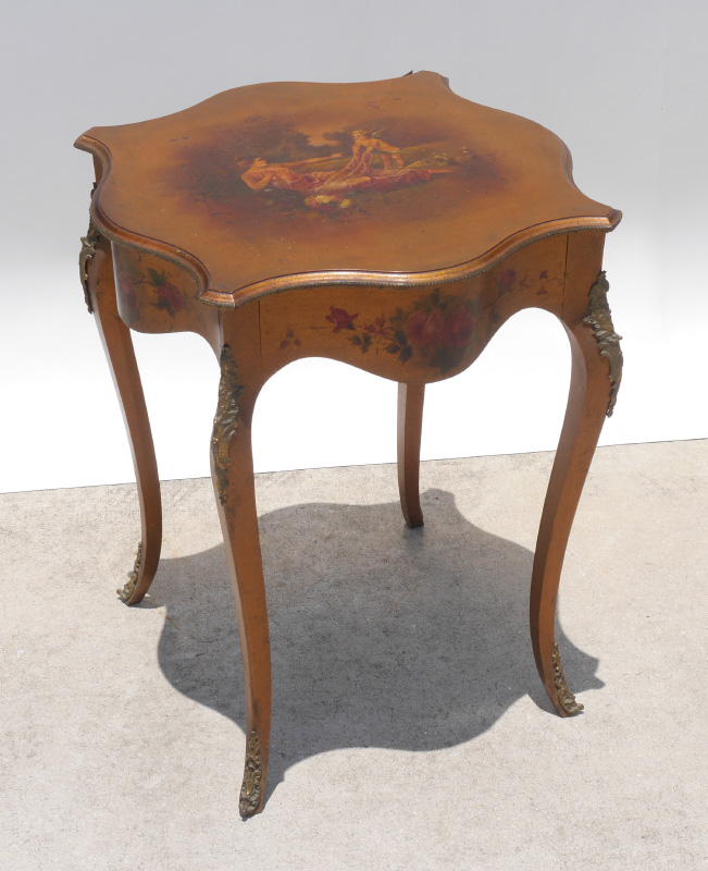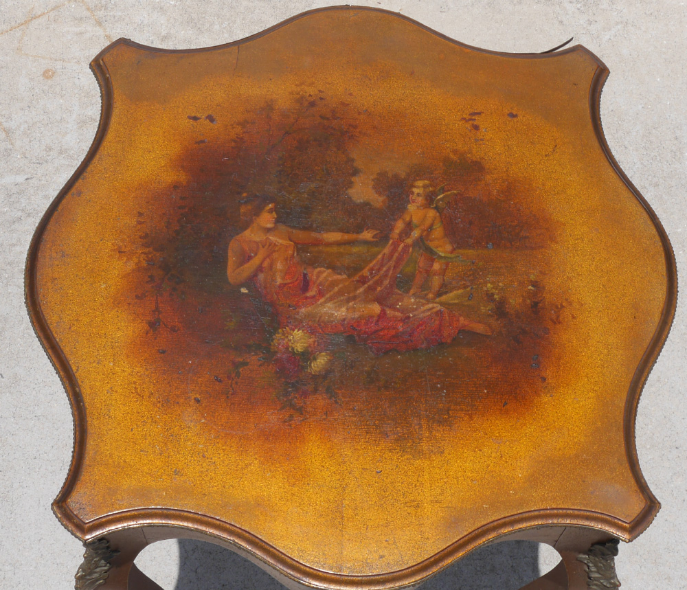 VERNIS MARTIN STYLE DECORATED SIDE TABLE: Shaped top with transfer outdoor genre scene featuring cherub and maiden. Serpentine sides with floral motifs, shaped legs with applied ormolu decoration. Overall 29 1/4'' h. x 24'' x 24''.
