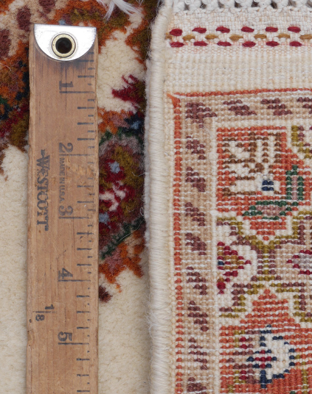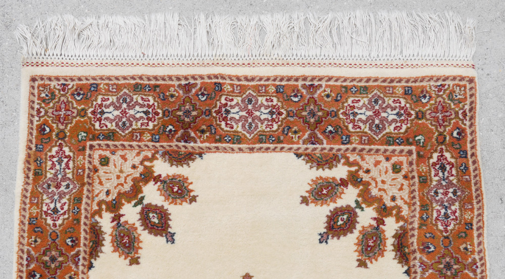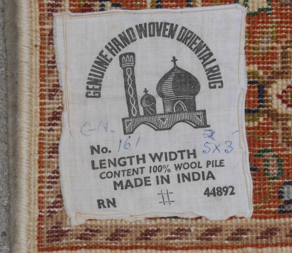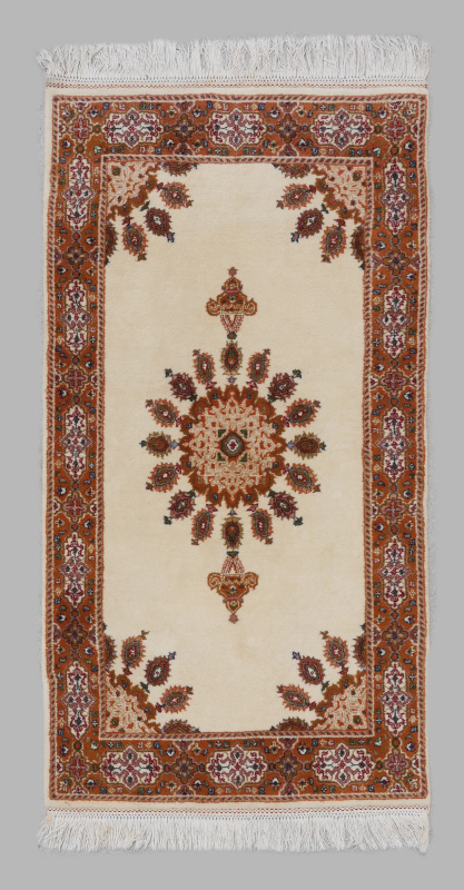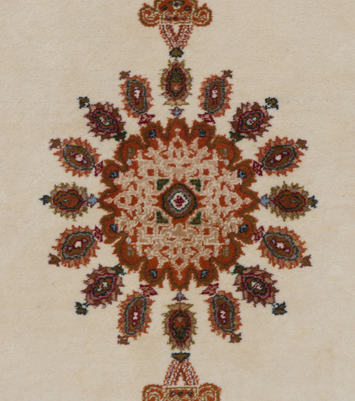 APPROX. 20-35 YR. OLD INDO-PERSIAN HAND KNOTTED WOOL RUG, 2'11'' x 5'2'': This rug has an open ivory field with a round central medallion that has spoke like pendants radiating out from the center. Also there are spandrels that look like hanging lamps at either end. The four corners of the field have quarter medallions and complete the design of the field.