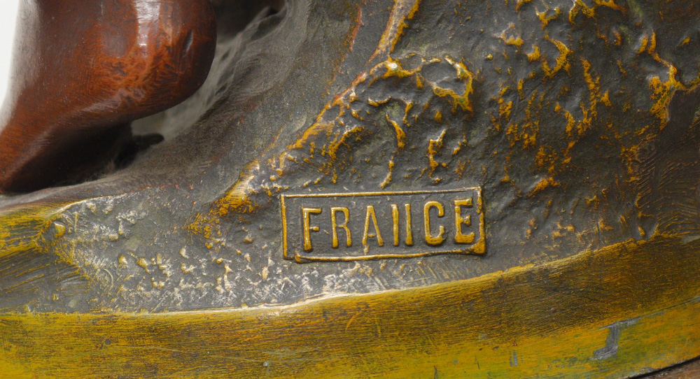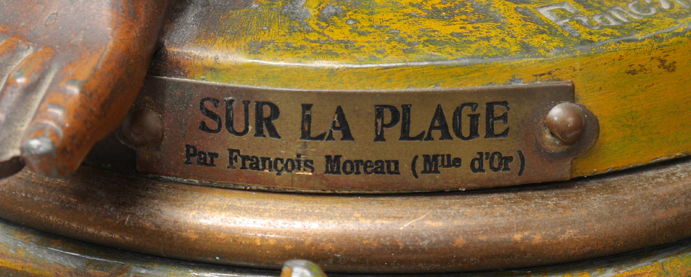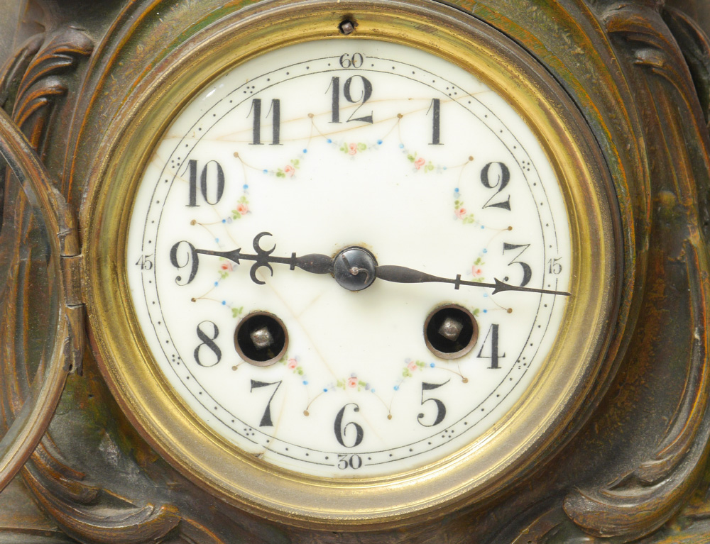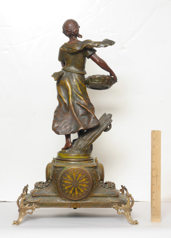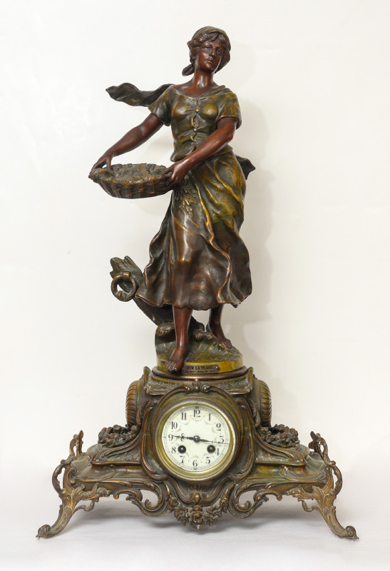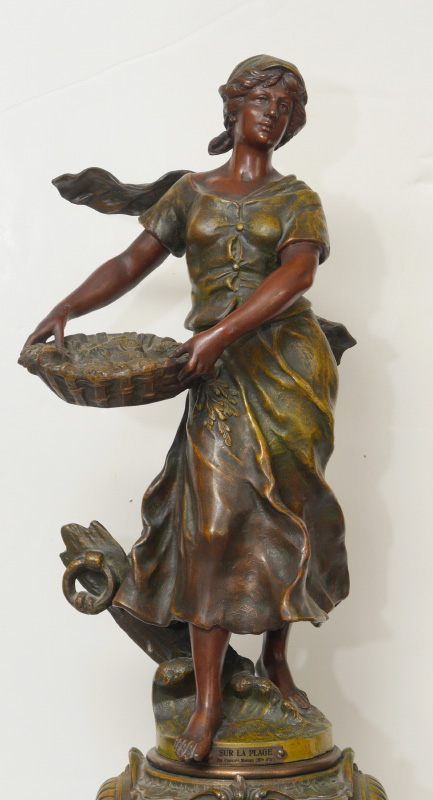 FRENCH SPELTER FIGURAL FEMALE MANTLE CLOCK: Patinated spelter figural maiden holding basket top titled ''Sur La Plage'' after Francois Moreau, rococo style cast spelter base on 4 feet. Porcelain dial with Arabic numerals and garland, unmarked French time and strike movement.