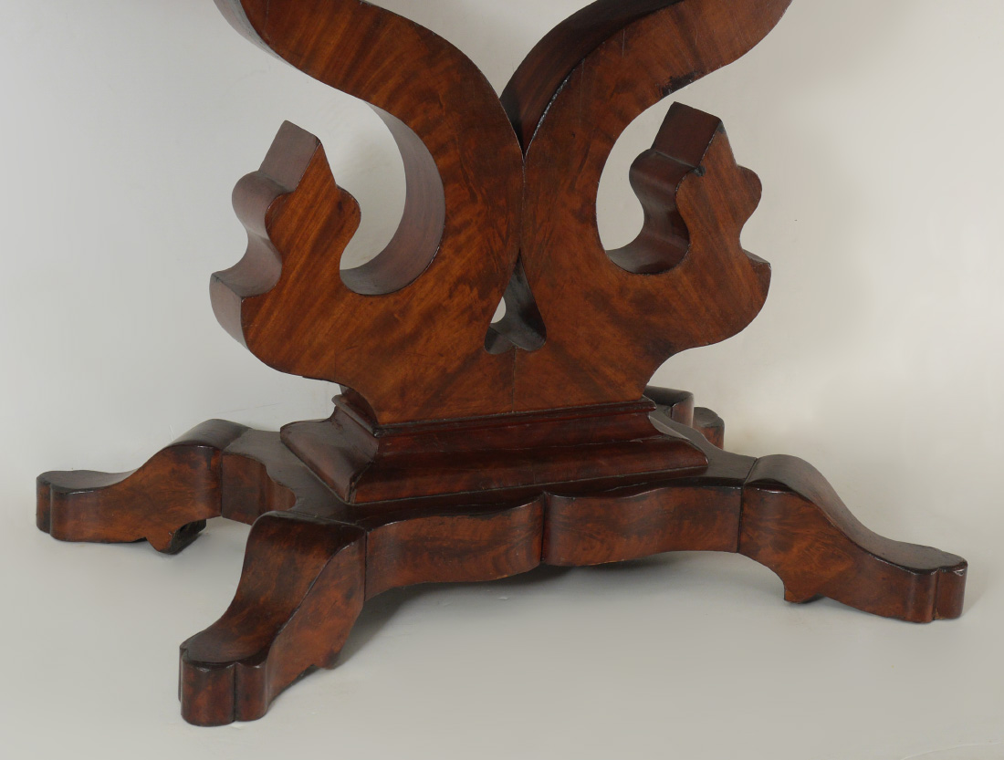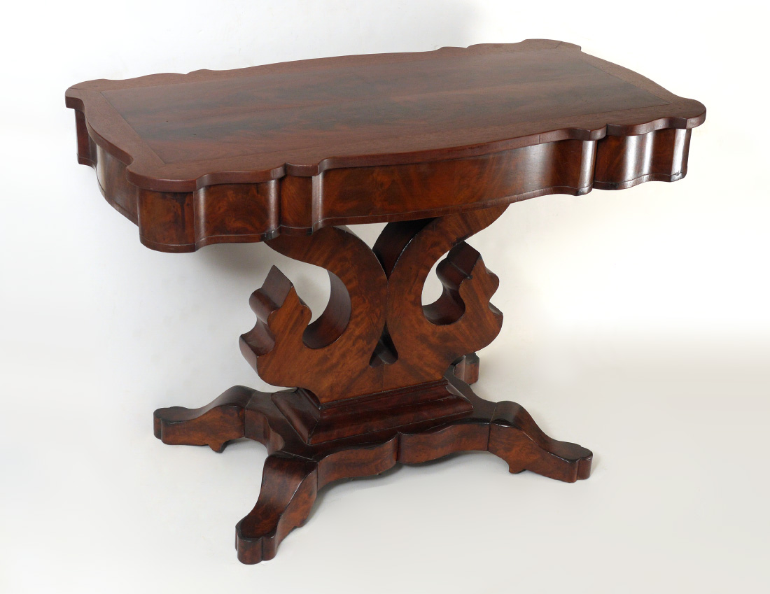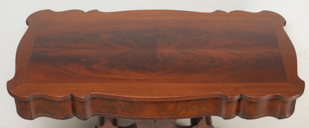 EMPIRE PERIOD FLAME GRAIN MAHOGANY PARLOR TABLE: Ca. 1850-60. Banded top, shaped top, sculpted apron. 27 3/4'' h. x 39 1/4'' x 21''.
