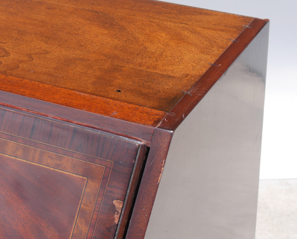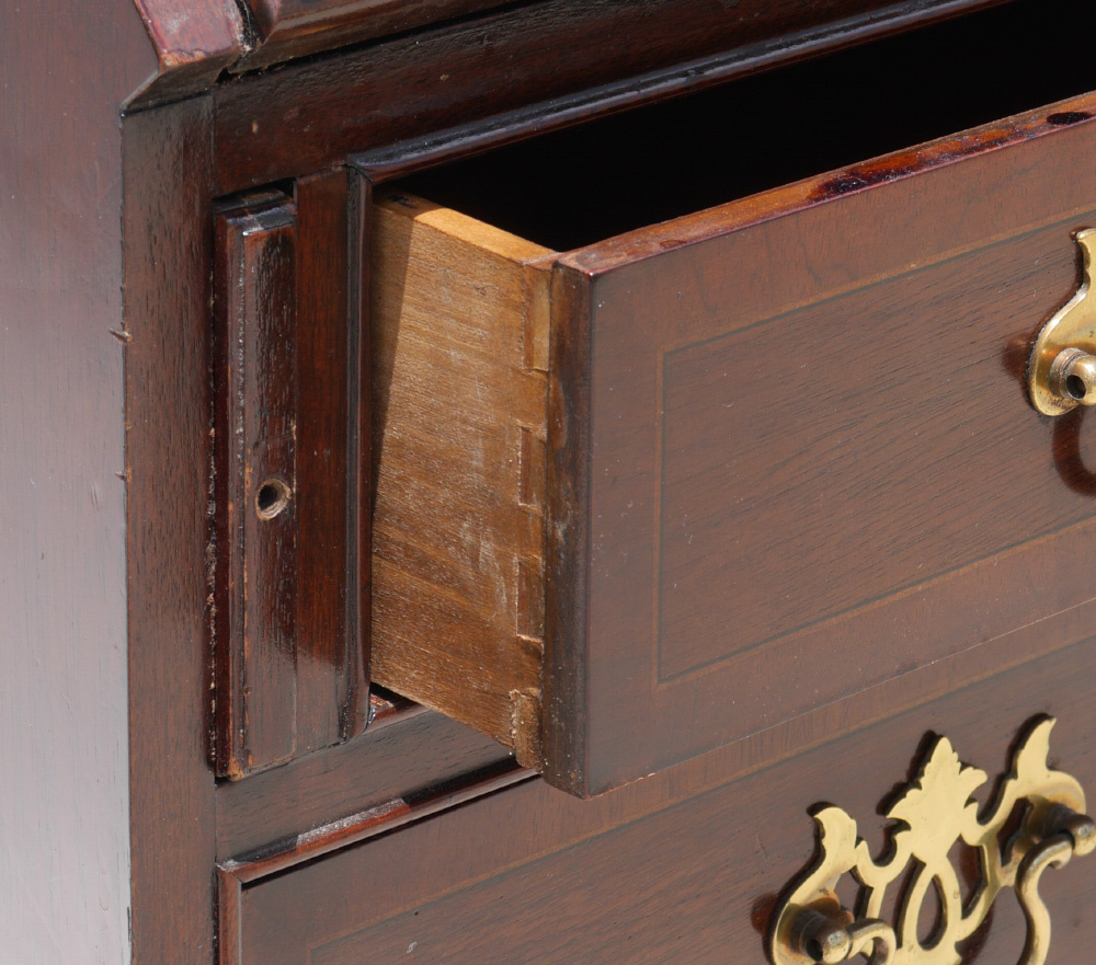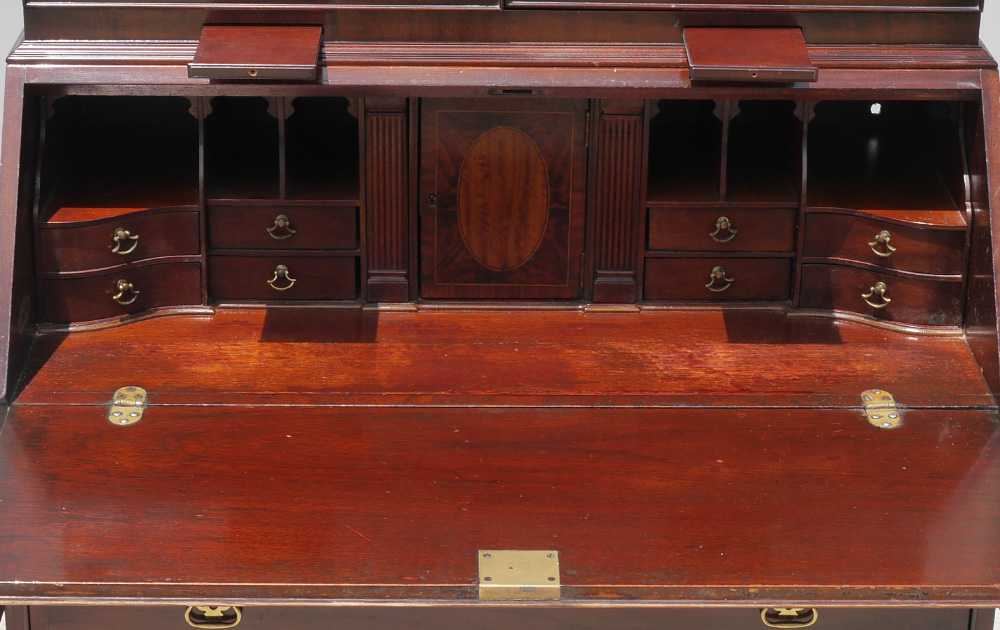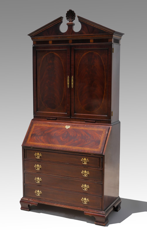 HEIRLOOM DROP FRONT SECRETARY BOOKCASE: Architectural pediment with carved leaf finial over 2 blind doors with oval banded inlay. Slant drop front base, interior single door, shaped drawers and pigeon holes. 4 full length graduated drawers with brass pulls, bracket feet. Overall 89 1/2'' h. x 42'' x 21 1/4''.