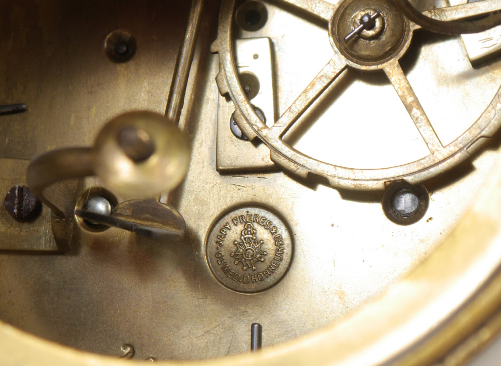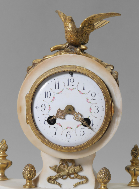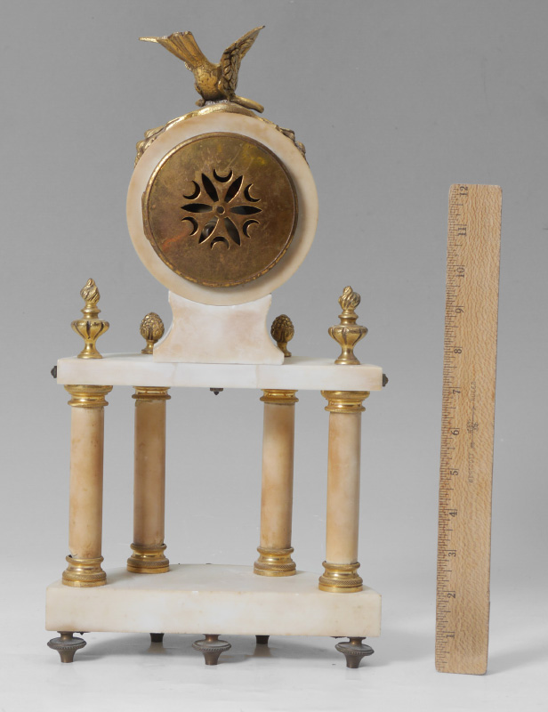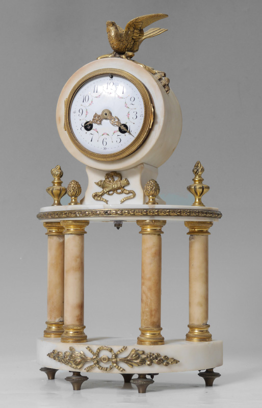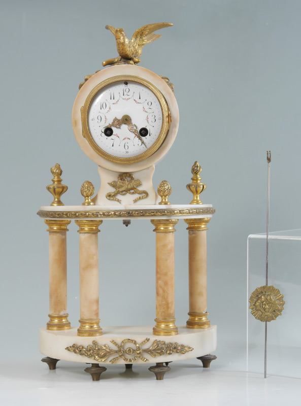 FRENCH MARBLE DEMI LUNE PORTICO CLOCK: Carved white variegated marble case with applied ormolu accents to include winged dove finial, spires, garland and ribbon, all on 5 feet. Porcelain dial with Arabic numerals, Japy Freres time and strike movement, overall measures 15 3/4'' h. x 8 1/4'' x 4''.