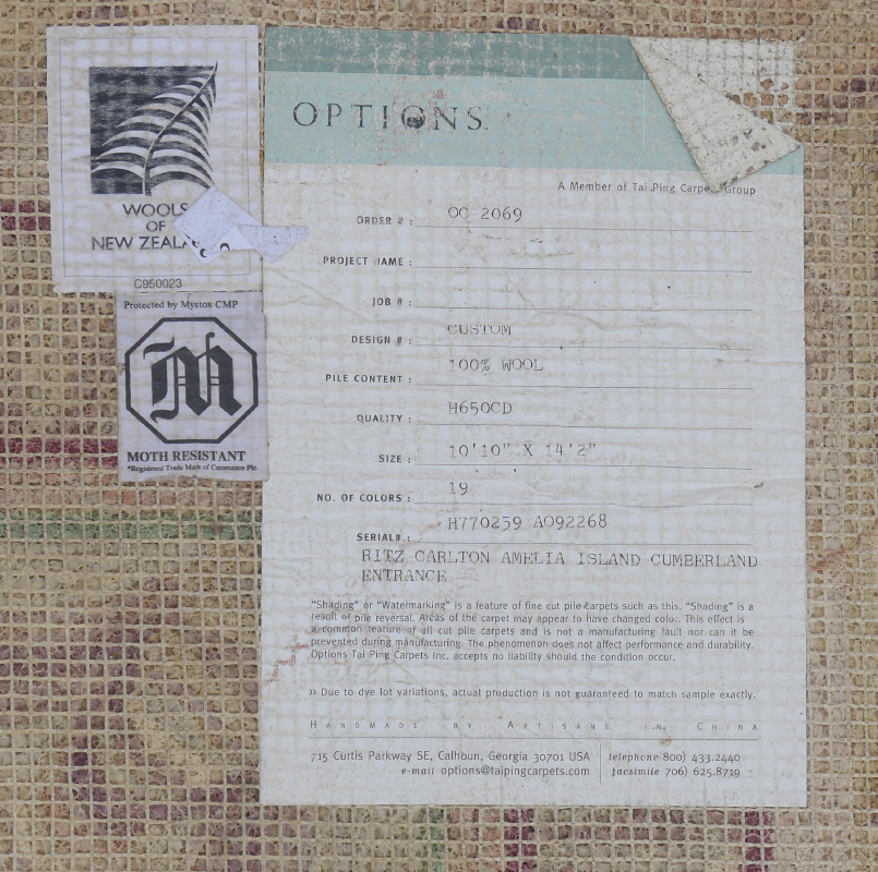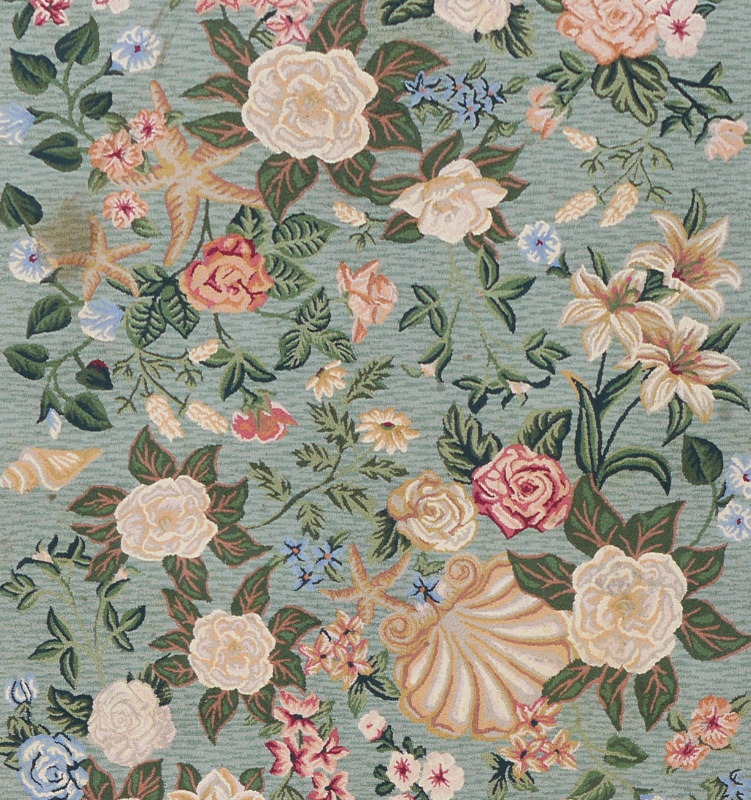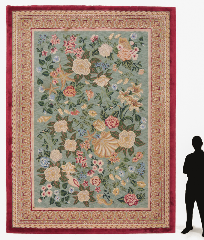 CUSTOM CONTEMPORARY WOOL CARPET, 10'11'' x 14'1'': Large red and green ''hook'' rug in a colorful floral and sea motif. Woven from New Zealand wool, 19 colors, Made by Options Tai Ping Carpets Inc. for Ritz Carleton Amelia Island, FL.
