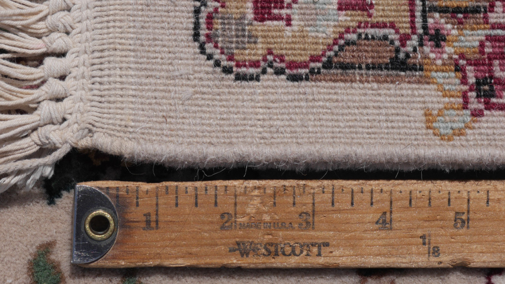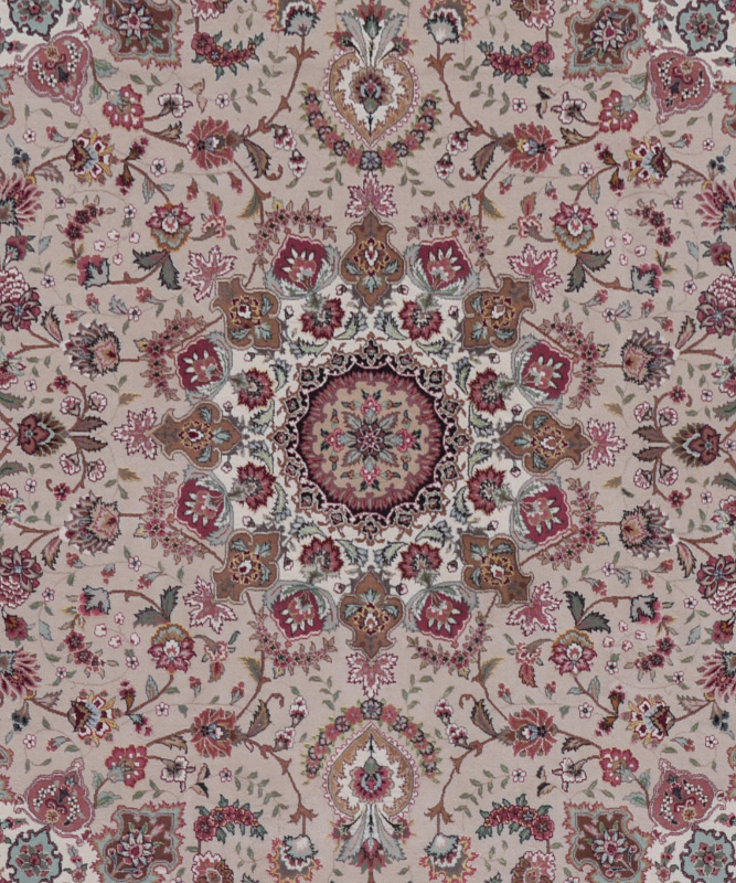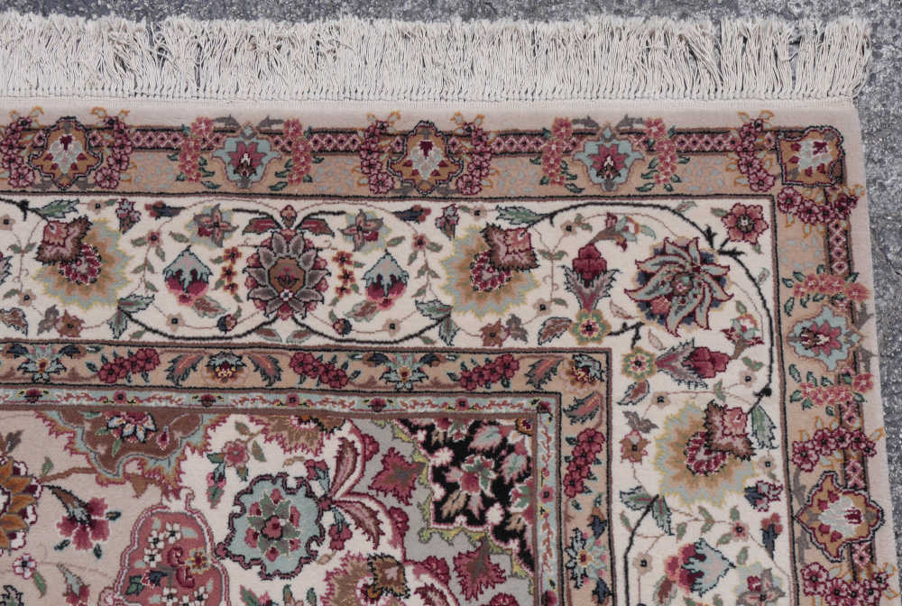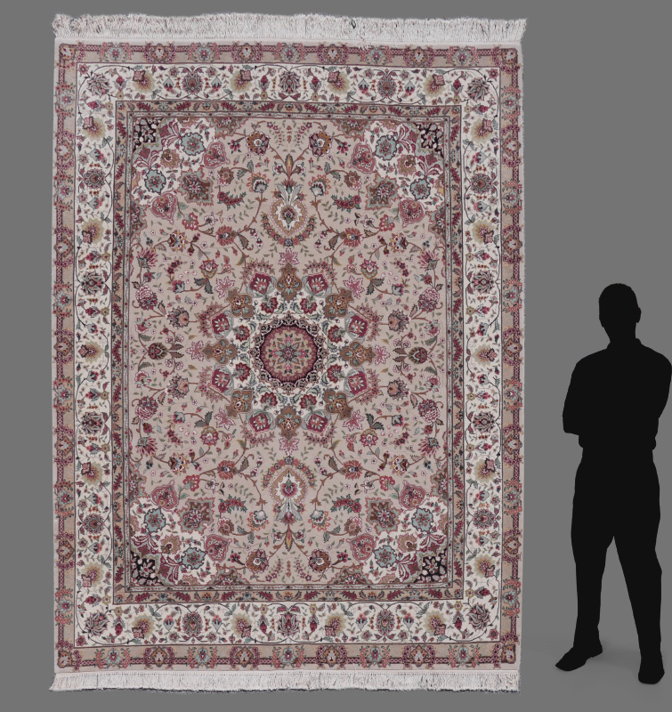 APPROX. 20-35 YR. OLD PERSIAN OR INDO-PERSIAN HAND KNOTTED WOOL RUG, 7'10'' x 9'10'': This rug is pretty in pink with a pale pink field, a round Ardebil type central medallion done in white and black with pink, raspberry, pale green and blue accents. The four corners are quarters of the central medallion in color and design. The balance of the field is covered with well-drawn palmettes, flowers, and leaves linked in places by vines. The white main border and guard borders nicely frame the central design. Condition is good.