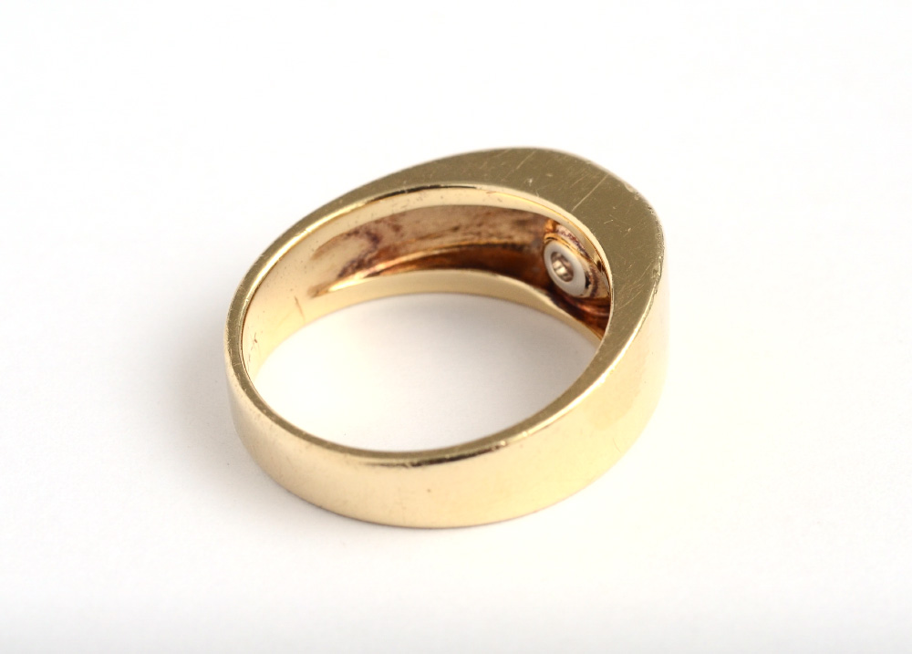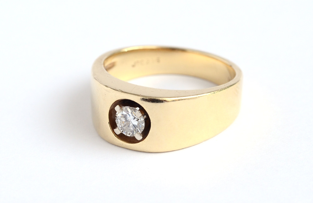MENS DIAMOND SOLITAIRE RING: 14K yellow gold ring centers one round brilliant cut, .33 Ct diamond, rated SI1 in clarity and H in color. The diamond is prong set. Weight: 8.9 grams. Size: 10