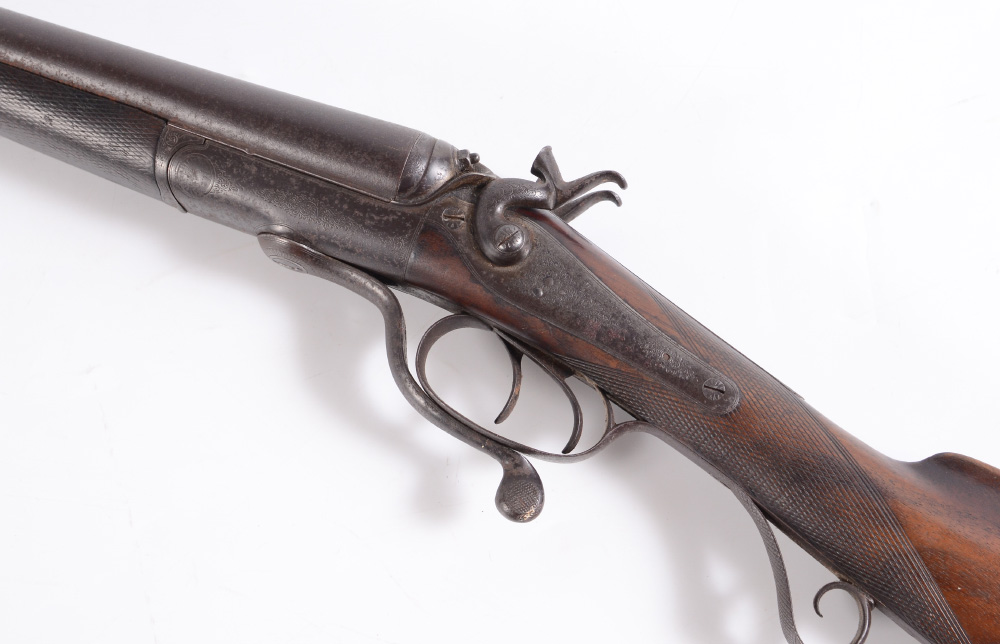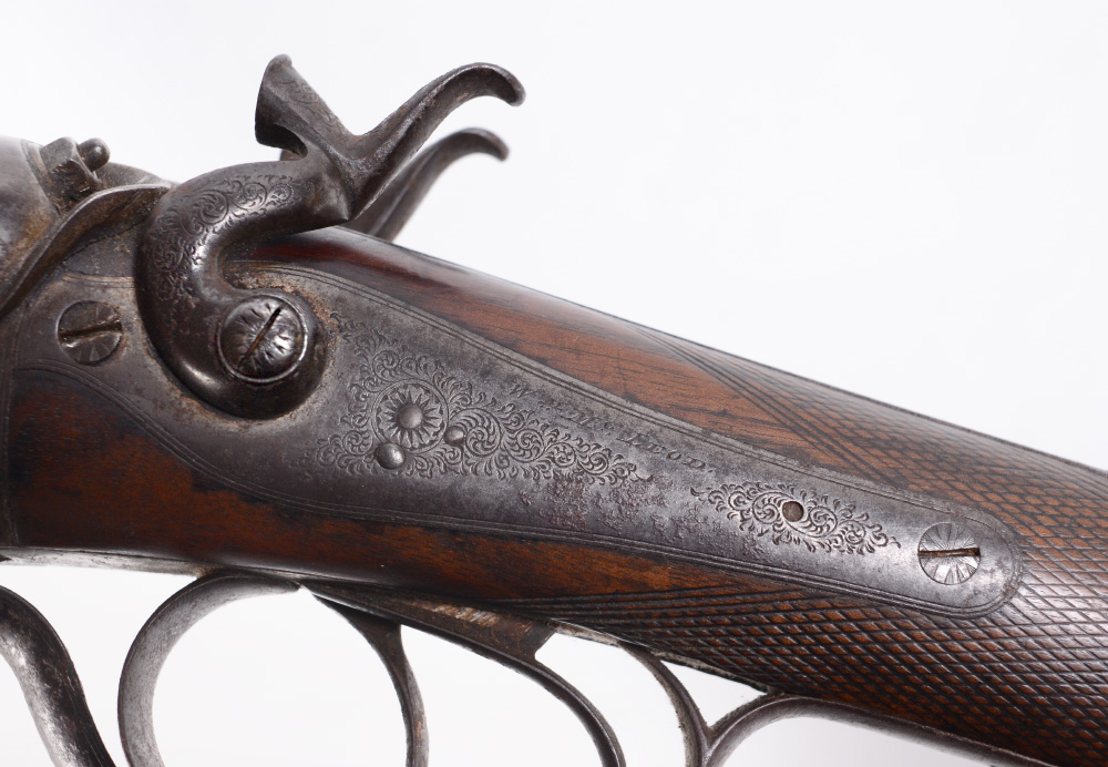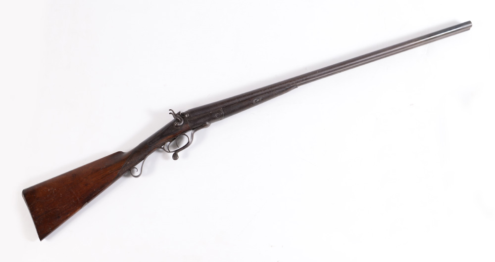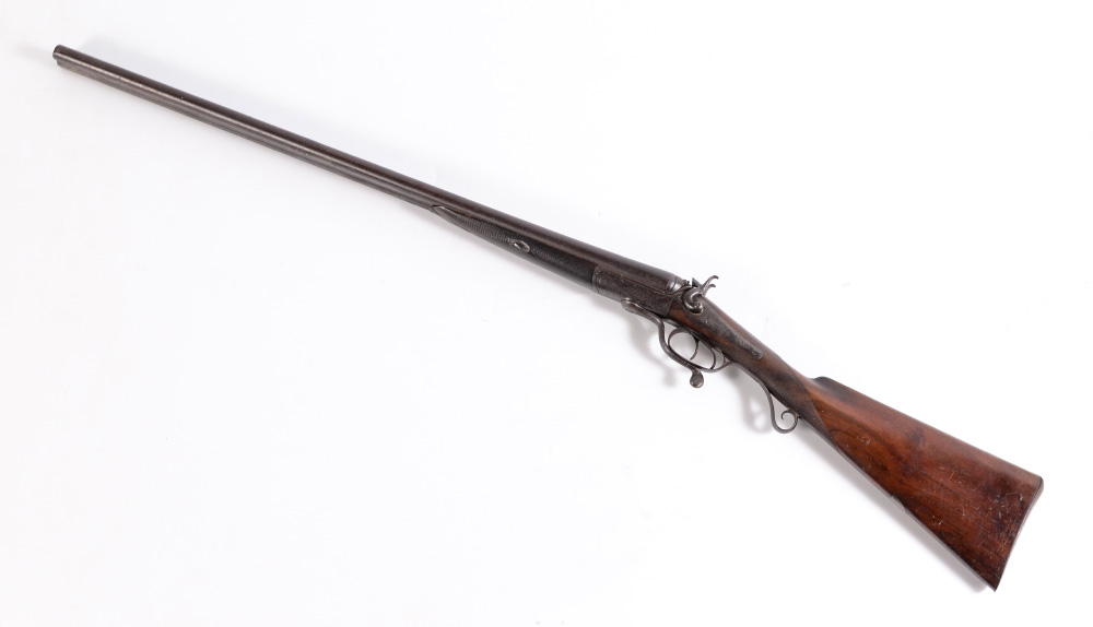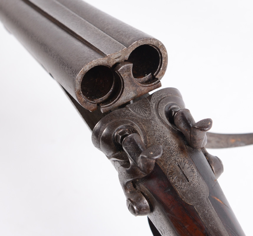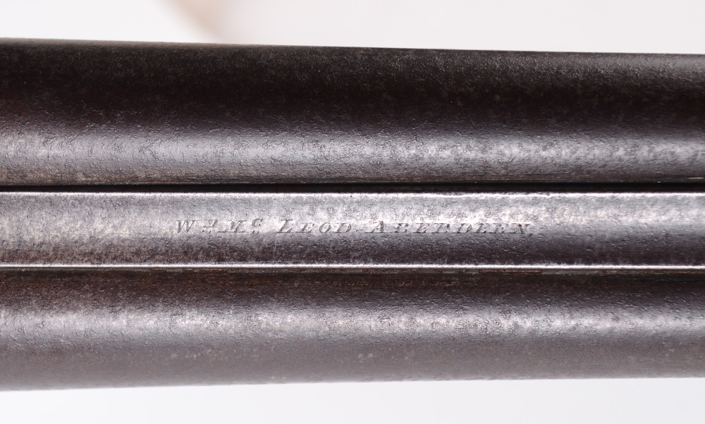 MCLEOD SCOTTISH DOUBLE BARREL SPORTING GUN: Late 19th century, 20 gauge side by side 28'' double barrels, swing arm loading lever. Lockplates with floral engraving and marked Wm. McLeod, barrel marked Wm. McLeod Aberdeen. Action currently working. Overall 44 1/2''.
