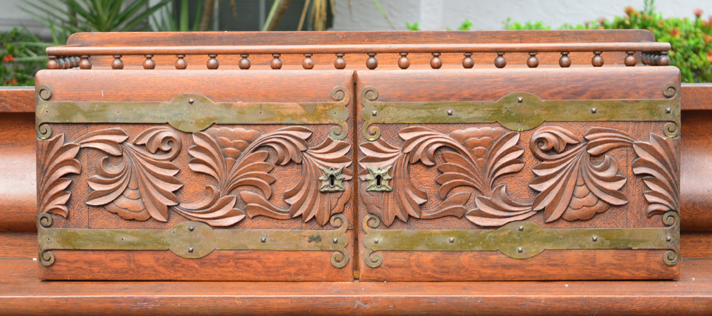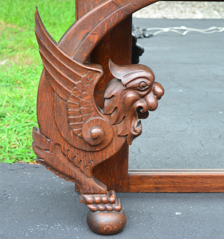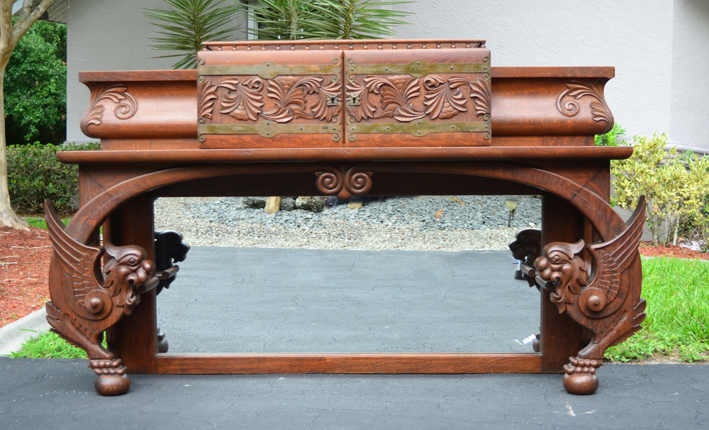 CARVED GRIFFIN OVER MANTLE MIRROR: Ball gallery over 2 doors with applied carved wood foliate and brass decoration, scroll design either side on back. Valence top over figural griffin supports. Overall measures 43 1/4'' h. x 72'' x 13 1/2''.