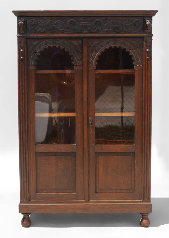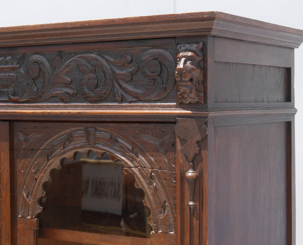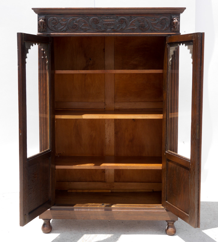 ENGLISH CARVED OAK CABINET: Early 20th century, carved pediment with urn, foliate scroll and lion masquerons. 2 arched glass doors with carved decoration, fluted stiles. On bun feet, 58 1/2'' h. x 37 3/4'' x 16 1/4''.