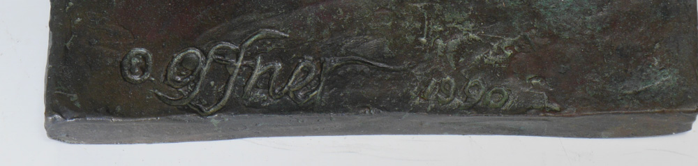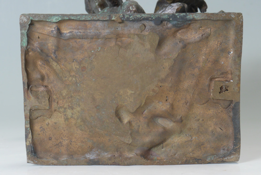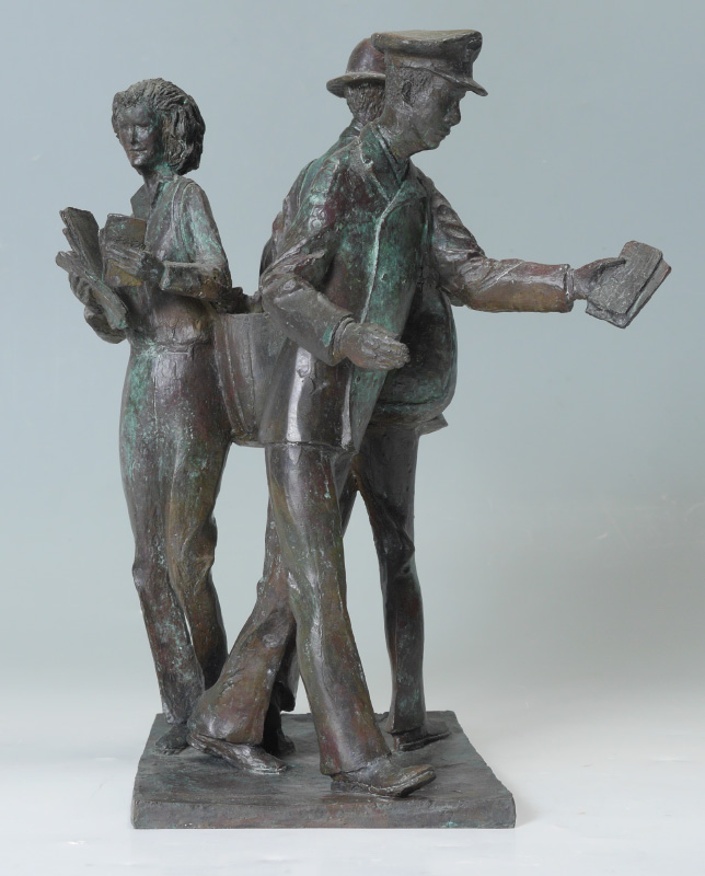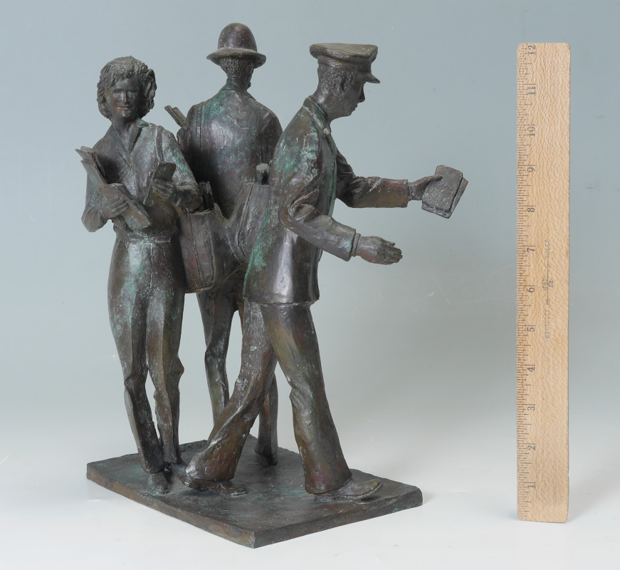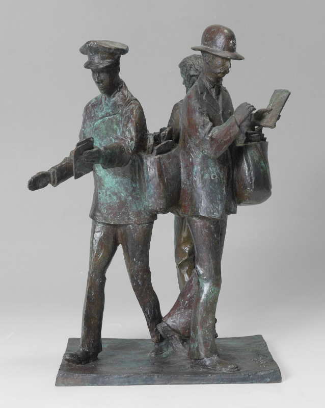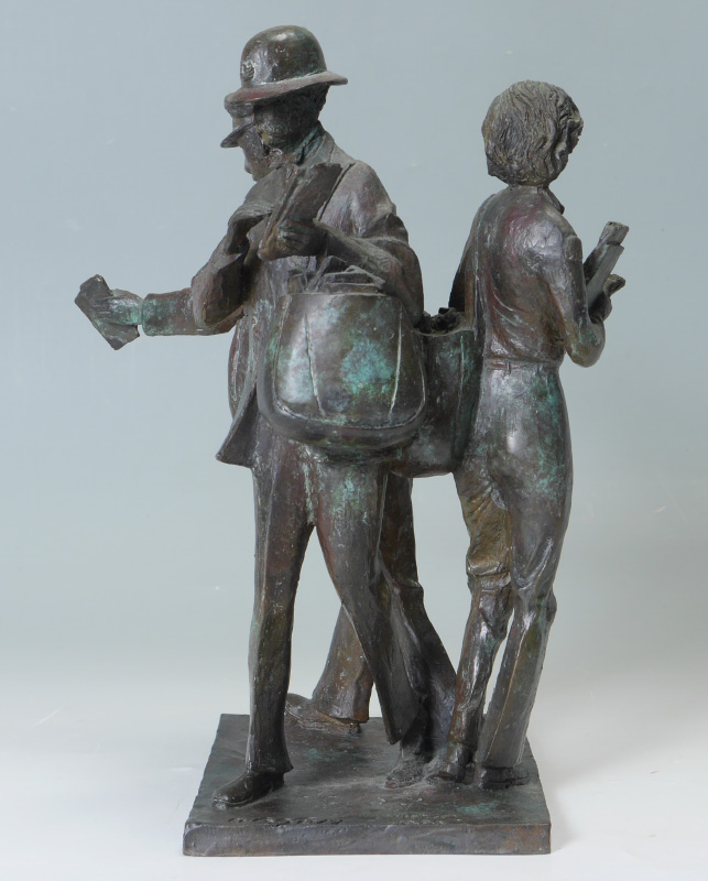 OFFNER, Elliot, (American, 1931-2010): Letter Carriers' Monument, Bronze Reduction, 12'' h. x 6'' d. x 9'' w., signed on the base and dated 1990. This sculpture was commissioned in celebration of the centennial of the National Association of Letter Carriers (NALC), and sits at the corner of North Plankinton and W. Wells, Milwaukee.