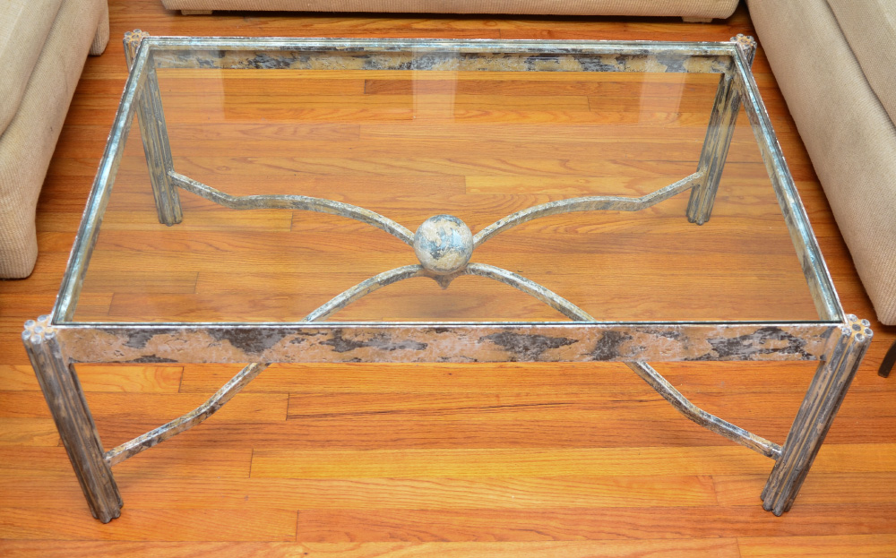 NIERMANN WEEKS GLASS TOP COFFEE TABLE: Custom made distressed painted metal base with fluted legs, shaped stretcher, 18'' h. x 28 1/2'' x 45 1/4'', inset glass top 42 1/4'' x 26''.