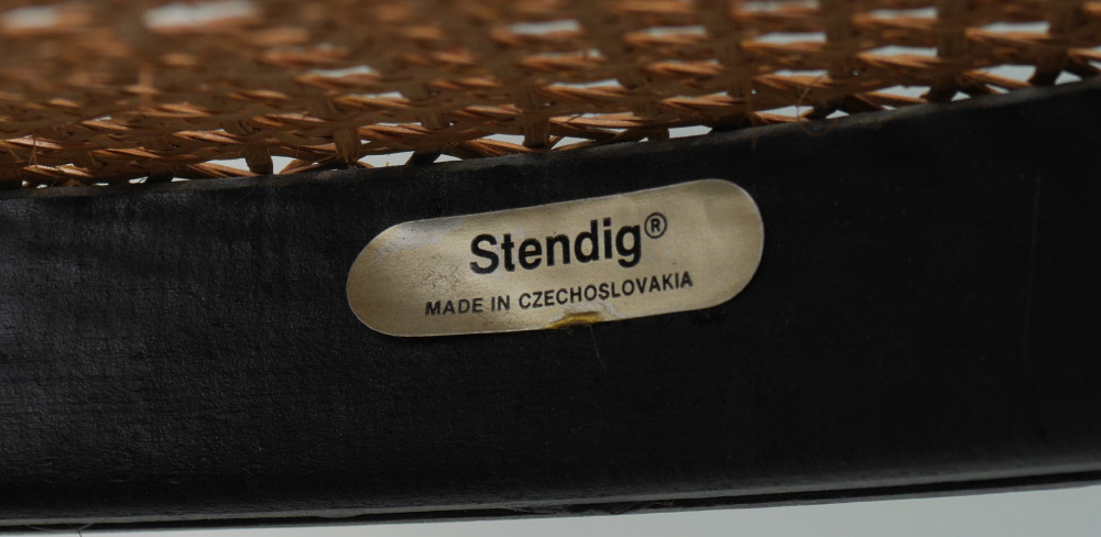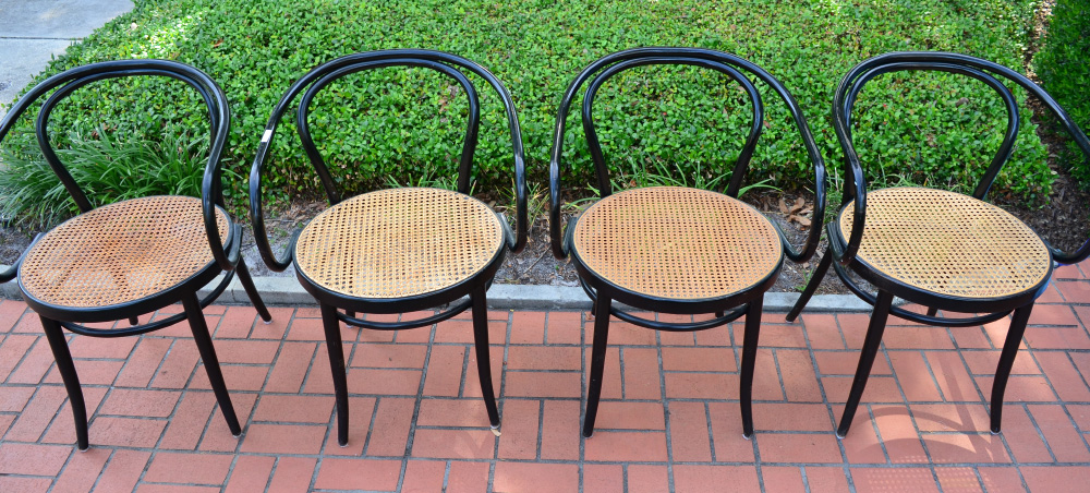 4 STENDIG COBUSIER BENTWOOD ARM CHAIRS: 4 ebonized bentwood armchairs designed by Thonet, caned seats, typically referred to as ''Le Cobusier'' chairs. Stendig Czechoslovakia label remains on one. Overall measures 31'' x 22'' x 21 1/2''.
