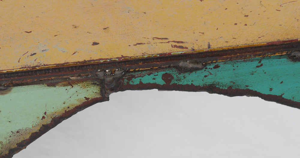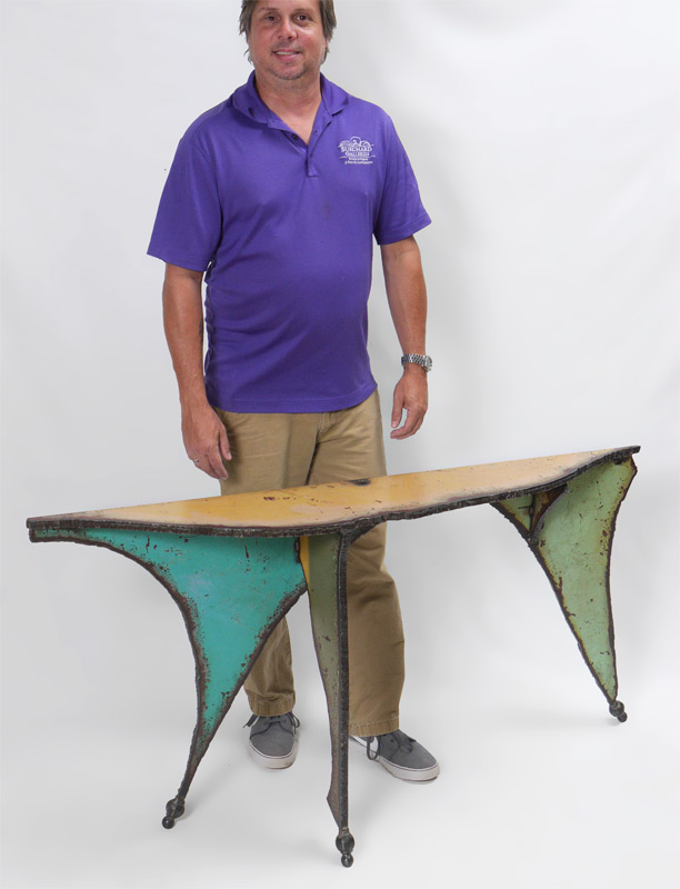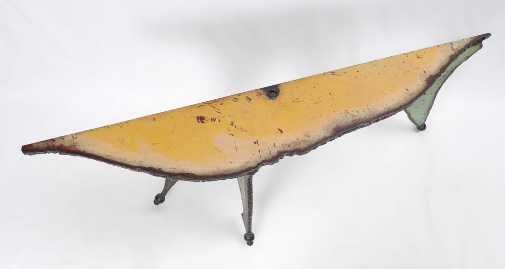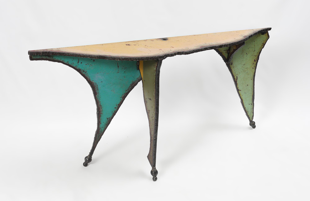WYNN, Cynthia, (American 20th/21st Century): Industrialist heavy welded metal polychrome decorated side table, free form design, on 3 legs. Overall 28'' h. x 55'' x 9 1/2''.