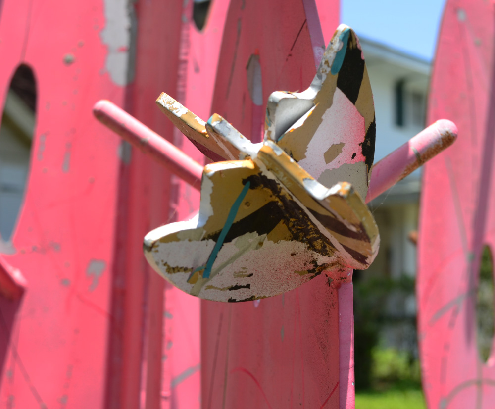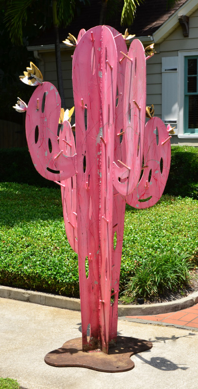PRESCOTT, Frederick, (American, 20th/21st Century): Welded metal Saguaro Cactus painted pink with spines and yellow flowers. Signed Prescott '88 on base. Sold with paperwork about Prescott, catalog page price of $8,800. 7' h. x 4'6'' dia. approx.