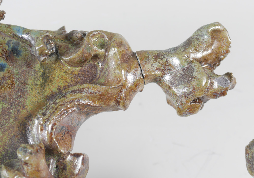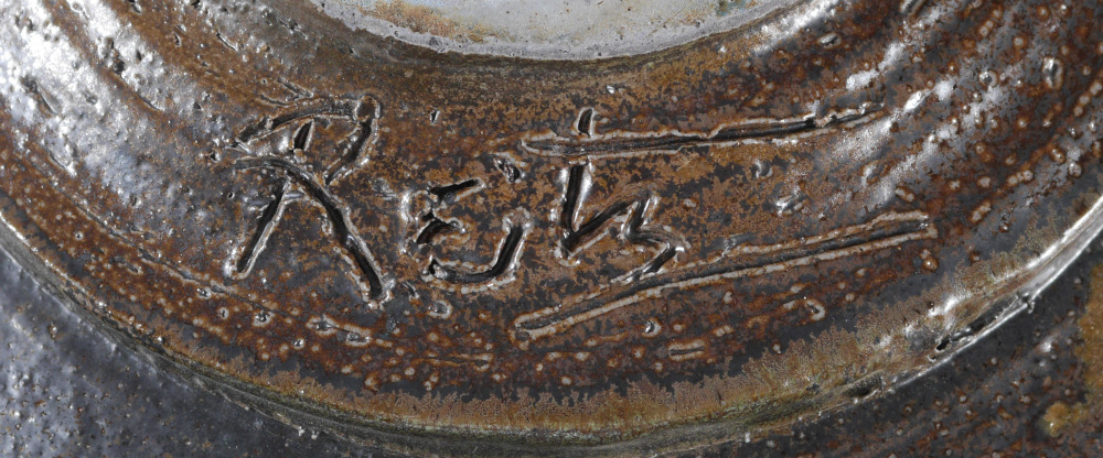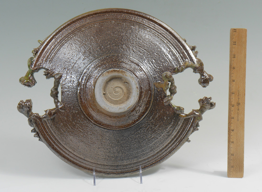 REITZ, Don, (American, 1929-2014): Clay pottery charger with abstract open handles, salt glazed decoration, incised signature on base. 3 3/4'' h. x 16 1/4''.