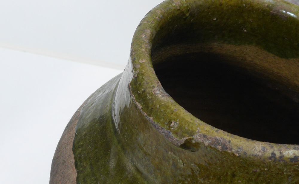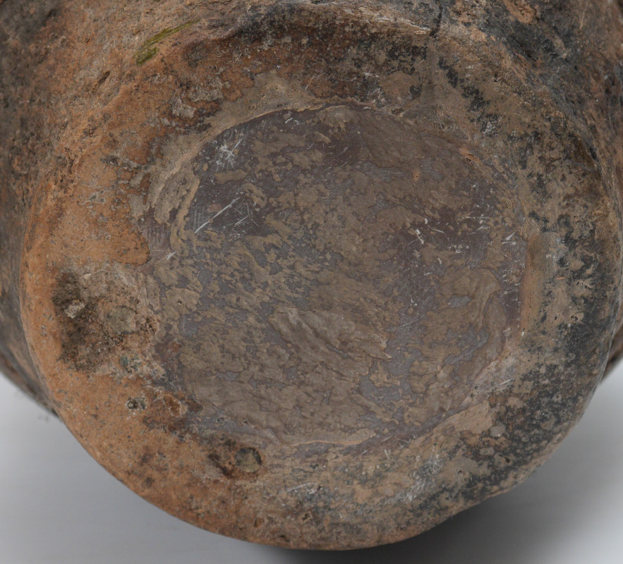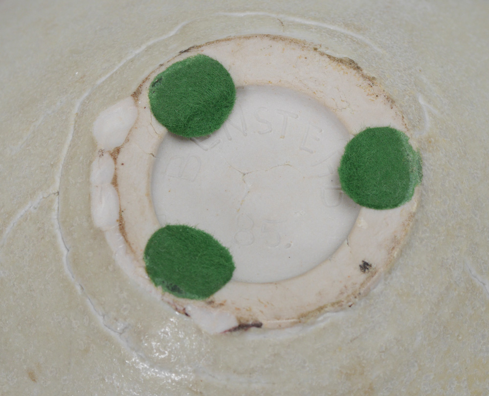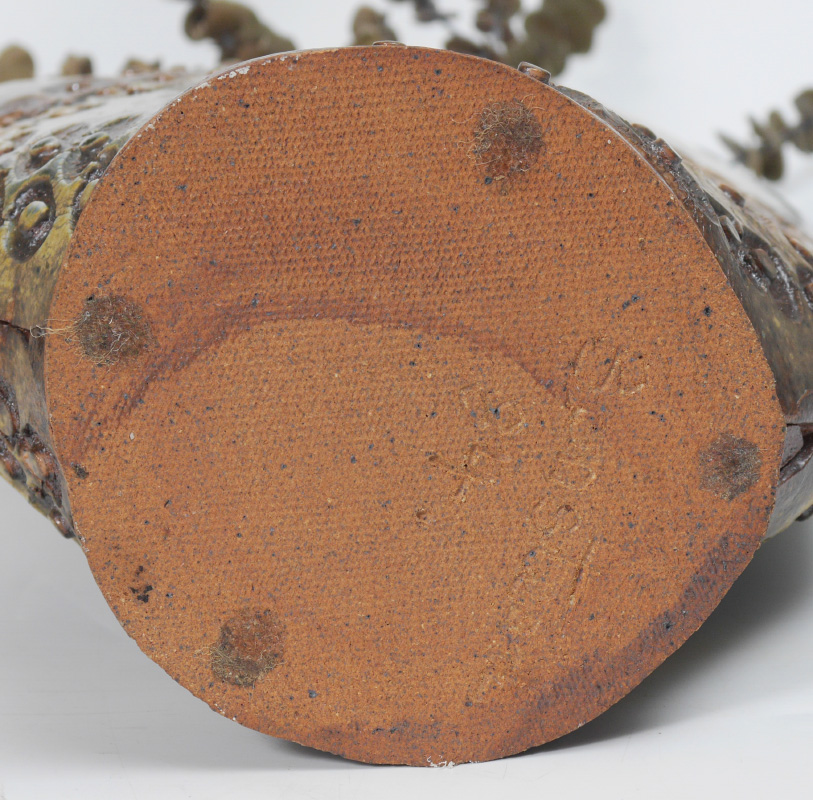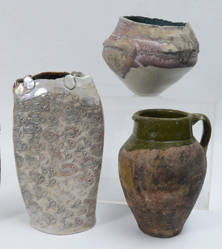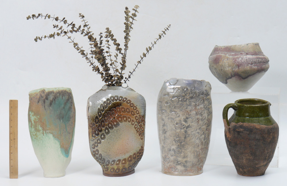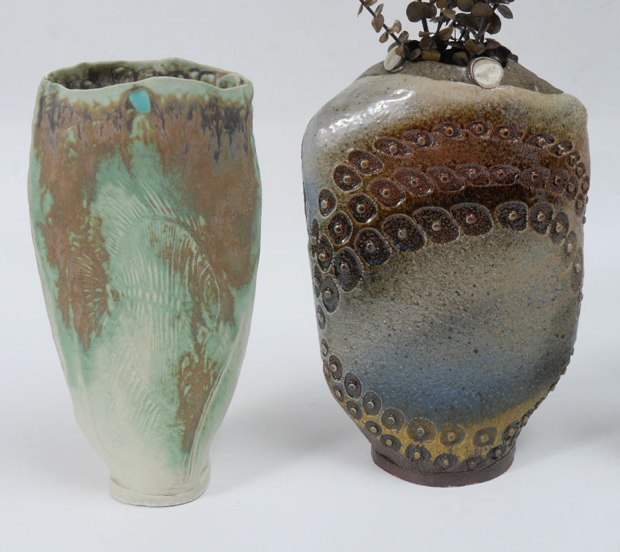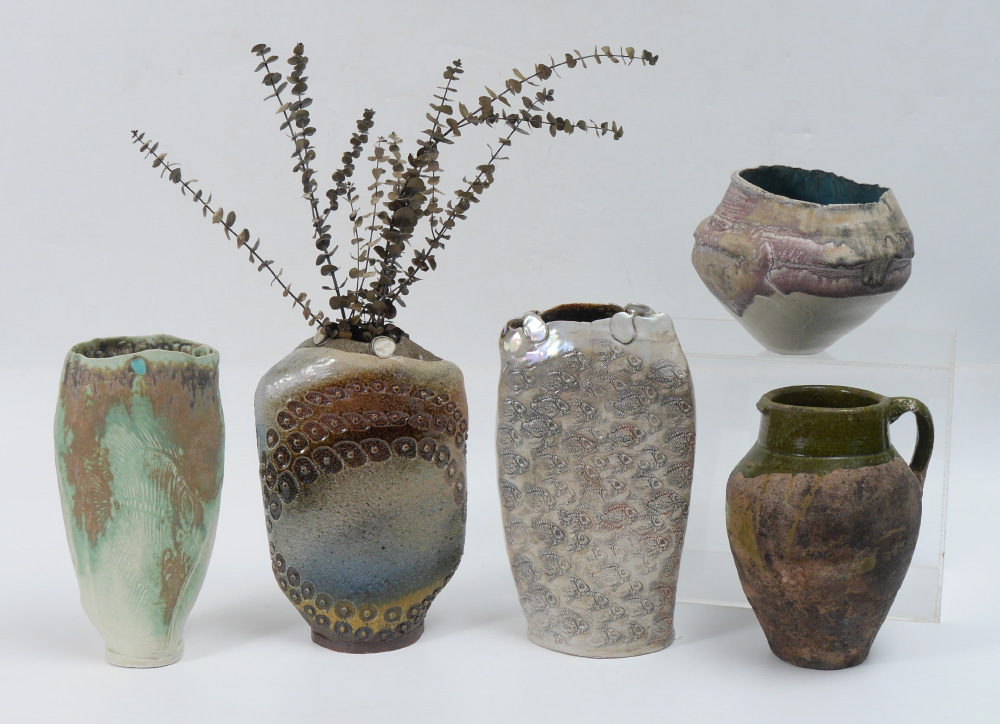 5 PIECE MODERN ART POTTERY COLLECTION: An assembled collection of 5 pieces total to include 1) Mottled green free form vessel, impressed palm leaf design, signed Benstead '86, 14'' h. x 7 1/2'' x 4''. 2) Iridescent tan glaze free form vessel, repeating raised figures of skeletal piranha fish, signed Benstead '84, 15'' h. x 8 3/4'' x 5 1/2''. 3) Mottled earth tones glaze free form vessel with rings of impressed circles, signed on base Benstead '84, 14 1/4'' h. x 9 1/4'' x 5''. 4) Polychrome earth tone exterior glaze, blue glaze interior vase/jardiniere with ragged rim, signed on base Benstead '85, 8'' h. x 10 1/4''. 5) Unsigned pitcher with green salt glaze on rim, neck, partial shoulder and partial handle. 11 3/8'' h. x 9''.