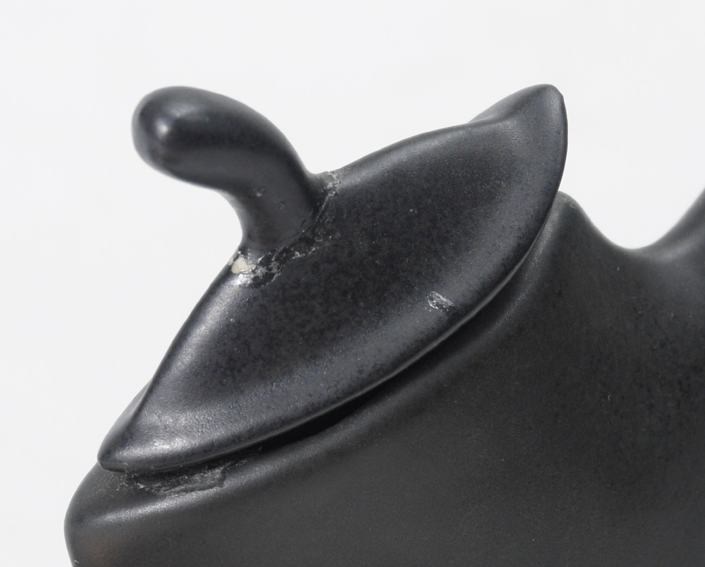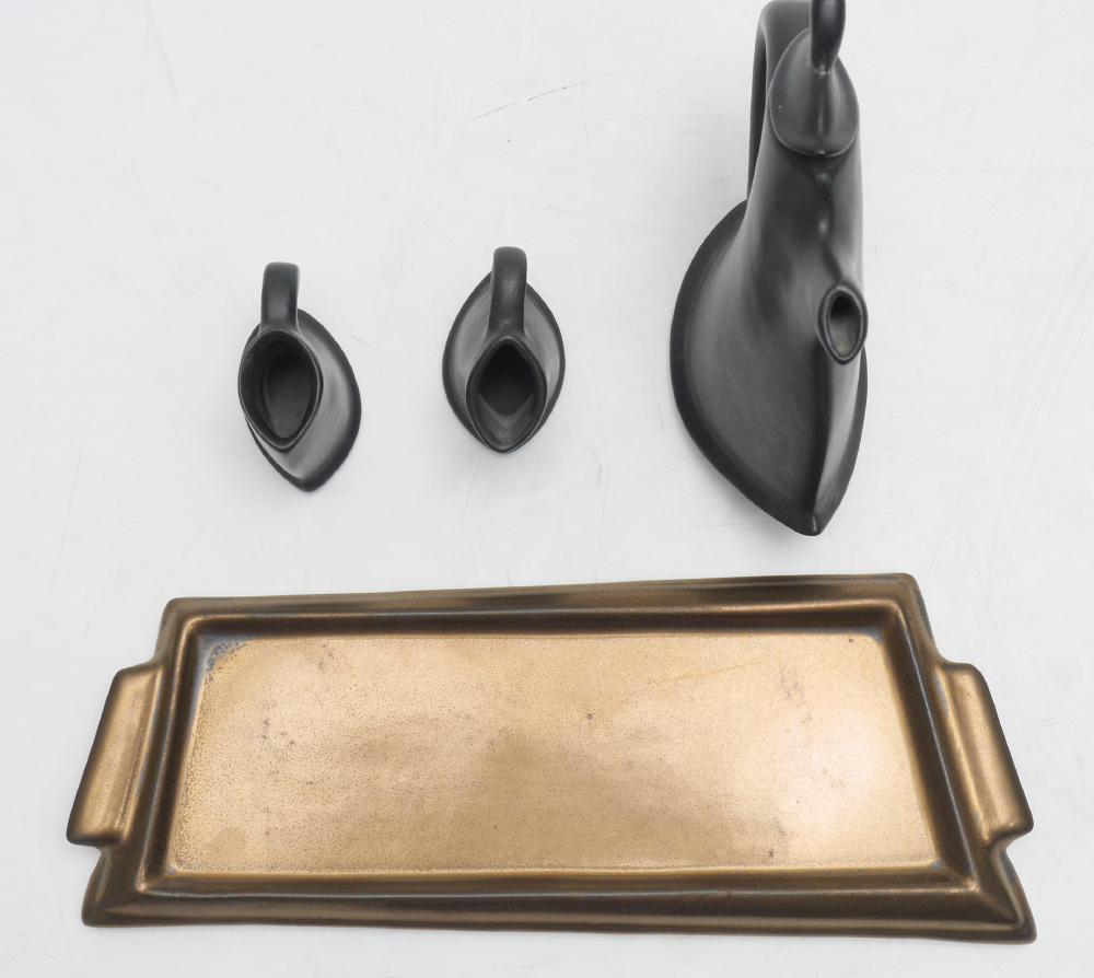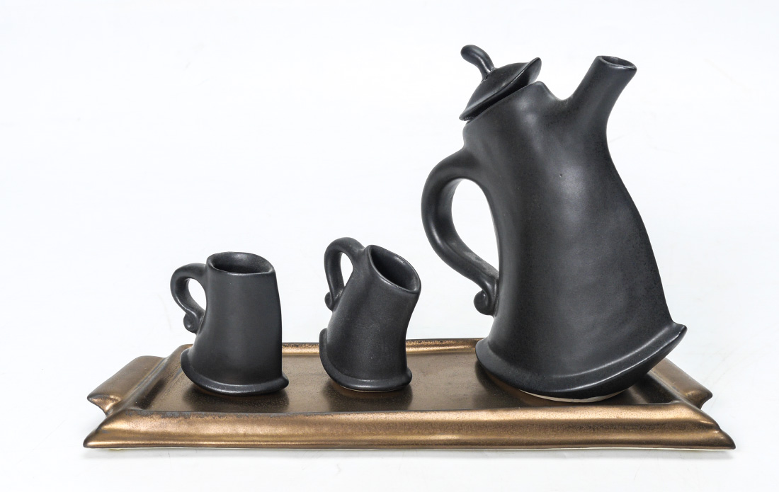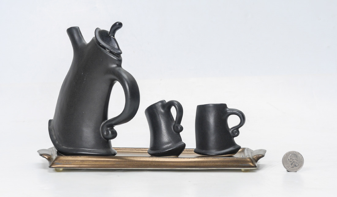 LAMBERT, Michael, (American, 20th Century): ''Struttin'', ceramic tea service. 4 pieces total with diminutive whimsical shape to include 1) Signed teapot, 6 3/8'' h. x 6''. 2-4) 2 handled mugs, 2 1/2'' h. 4) Signed gilt decorated tray, 11 1/2'' x 4 1/4''.