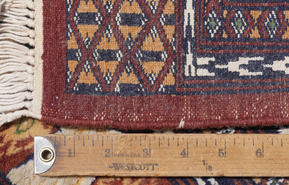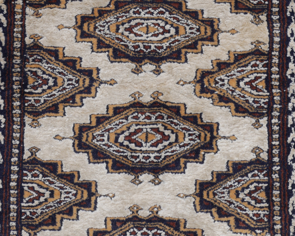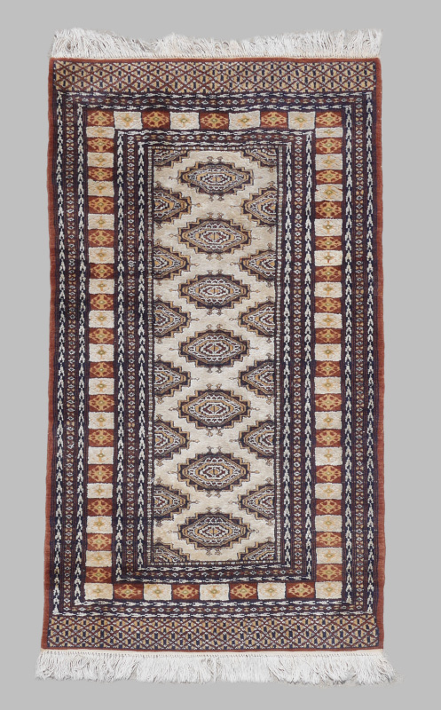 APPROX. 25-40 YR. OLD PAKISTANI-BOKHARA HAND KNOTTED WOOL AND COTTON RUG, 3'2'' x 5'3'': This Pak Bokhara has a traditional central design but has a more neutral palette than is usual for these rugs. The pale grey field has staggered rows of the same design ''gul'' done in grey, black, pale yellow, and white. Multiple guard borders surround a main border that consists of alternating color blocks with a single simple motif in the center of each one. Condition is good.