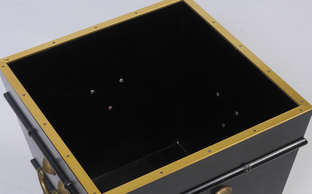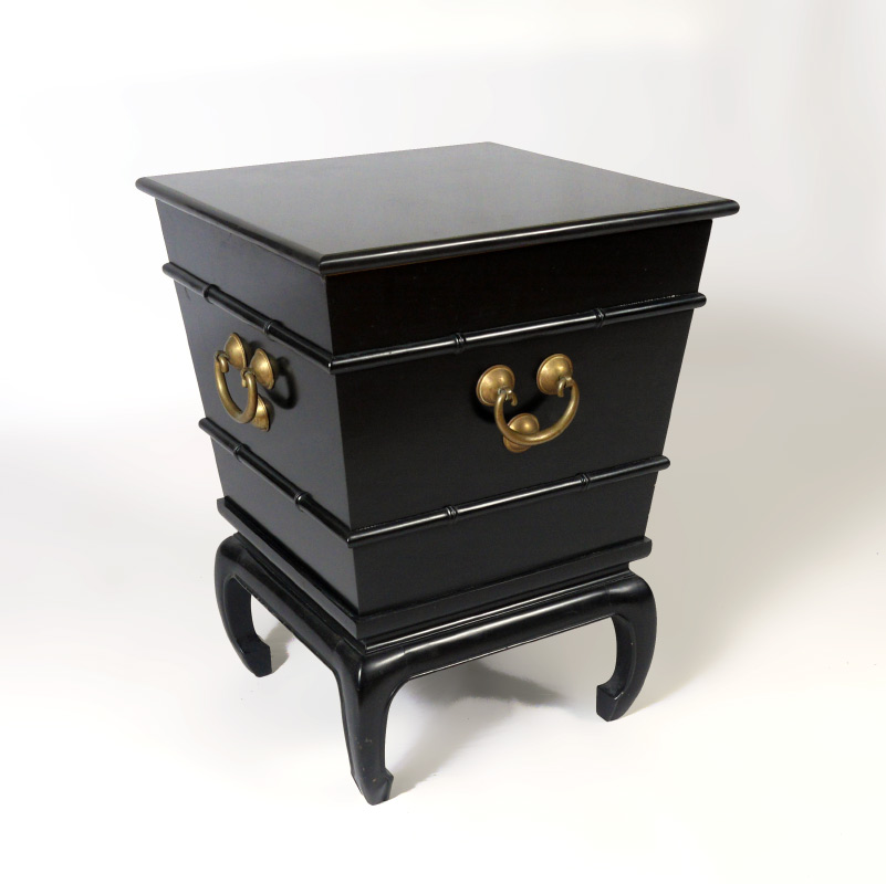 LANE ORIENTAL STYLE SQUARE STAND: Granite, or other black stone, top lifts to reveal open storage, tapered wood sides with brass handles, attached base with shaped legs. Pressed Lane mark to underside. Overall 27'' h. x 20 1/2'' x 20 1/2''.