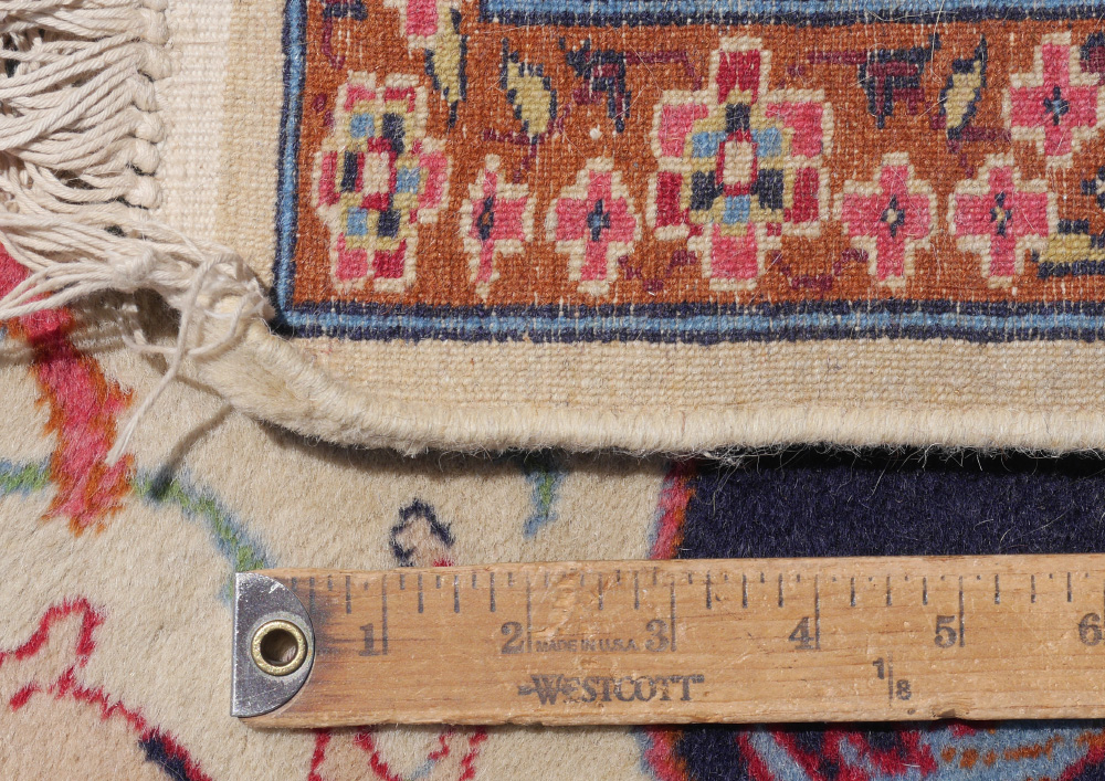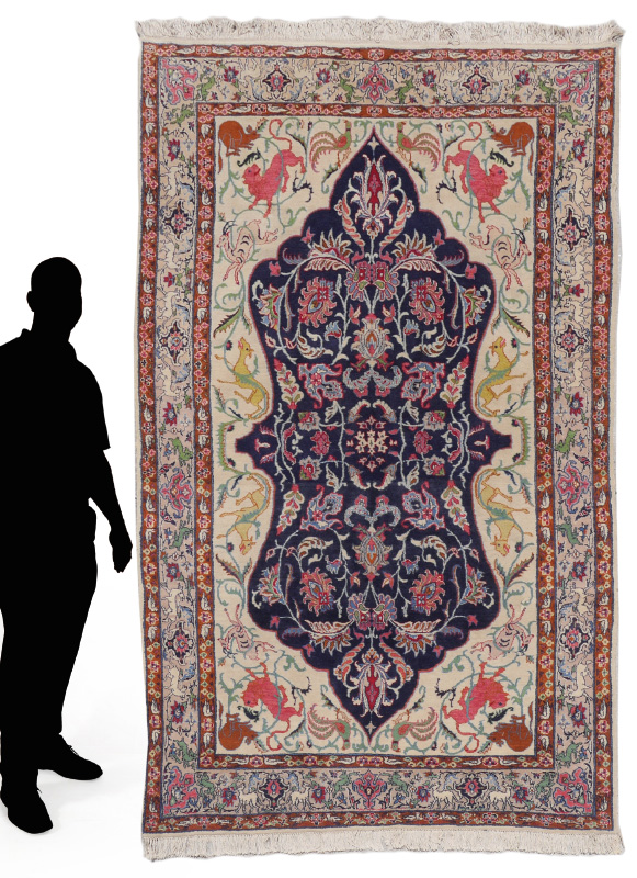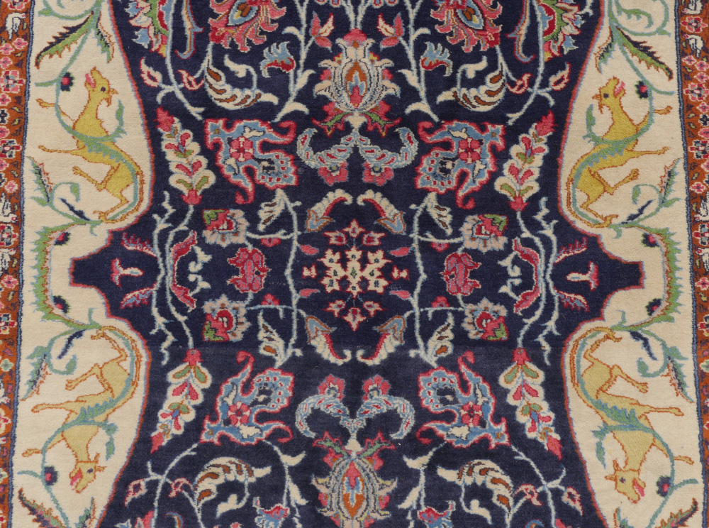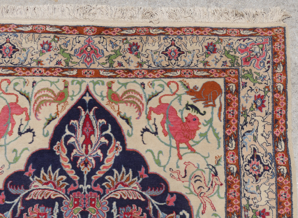 APPROX. 20-35 YR. OLD PERSIAN OR INDO-PERSIAN HAND KNOTTED WOOL RUG, 5'2'' x 8'3'': This is a beautiful rug with a jewel like deep blue center ground surrounded by a white outer field. The inner blue field is covered with a design of large palmettes, flower heads, and leaves linked by a system of vines. The outer white field has a delicate tracery design interspersed with fantastically colored animals including hot pink and orange tigers and pale pink and blue gazelles! The borders also contain many depictions of birds and animals intertwined in the floral motifs. This is a very striking rug that would be a real conversation piece in any home. Condition is good.