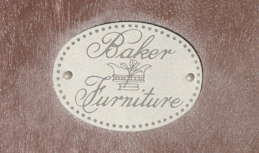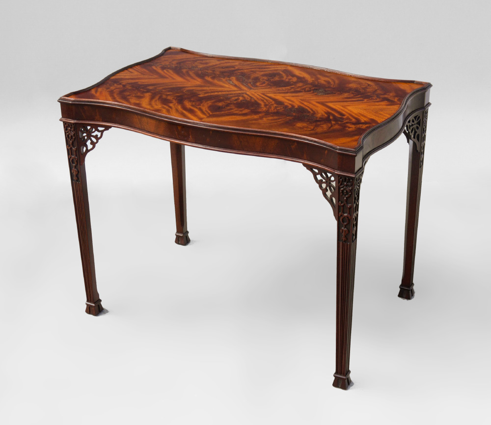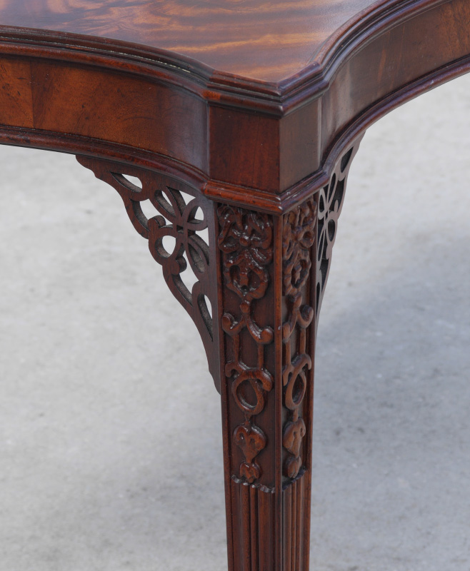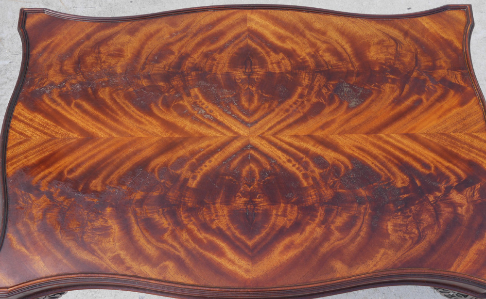 BAKER CHIPPENDALE STYLE OCCASIONAL TABLE: Shaped top with book matched crotch mahogany veneer. Carved tapered legs with pierce carved decoration at joints, Baker Furniture tag under top. 27 1/4'' h. x 34 1/2'' x 22 1/4''.