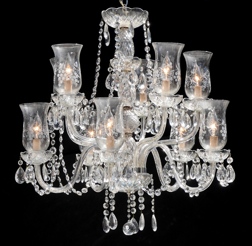 CUT CRYSTAL 10 LIGHT CHANDELIER: Cut crystal body, etched shades with grape vine motifs, prisms, drops and swags. Overall 27'' h. x 24''.