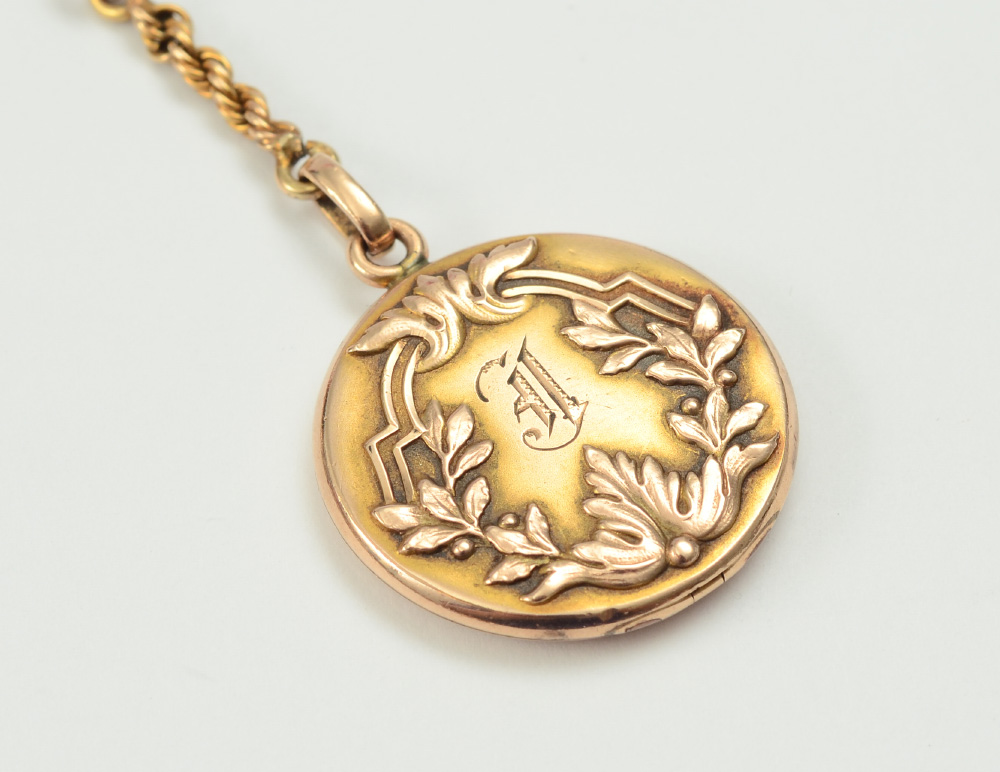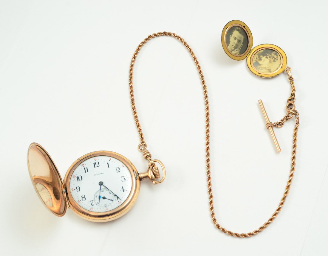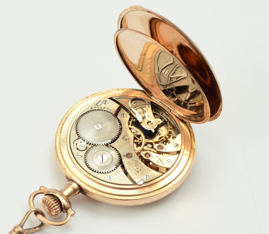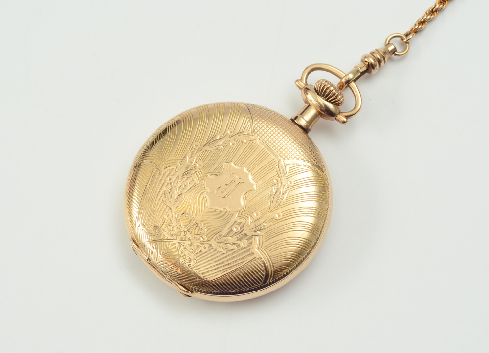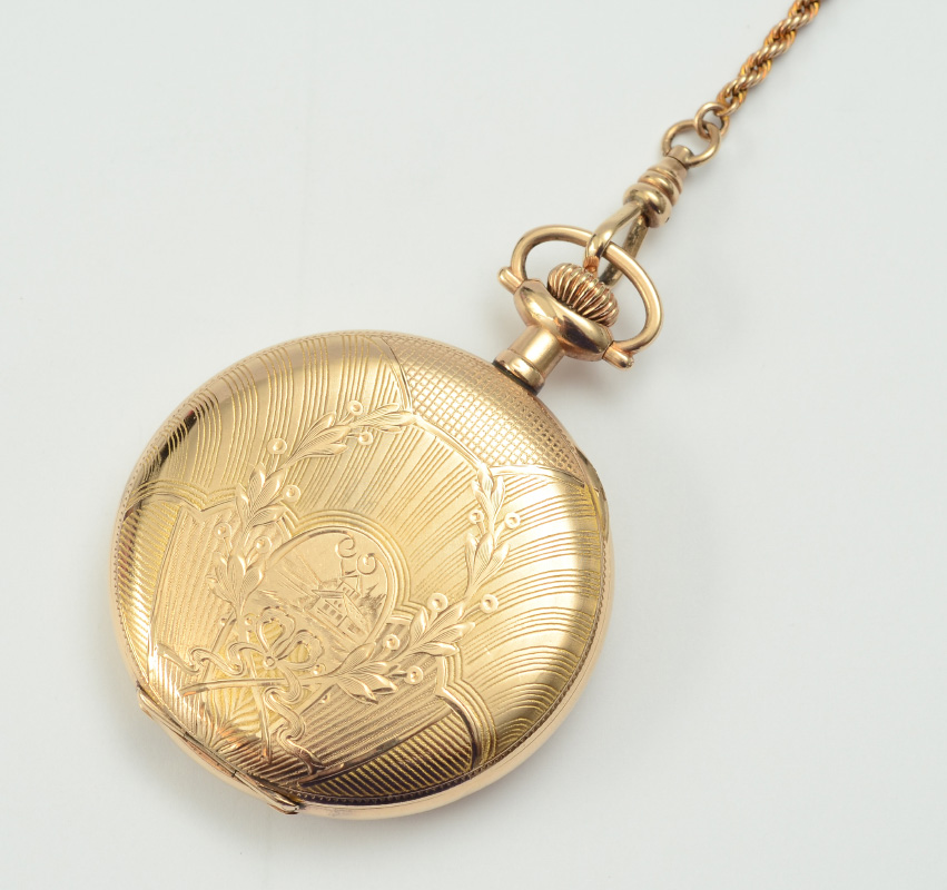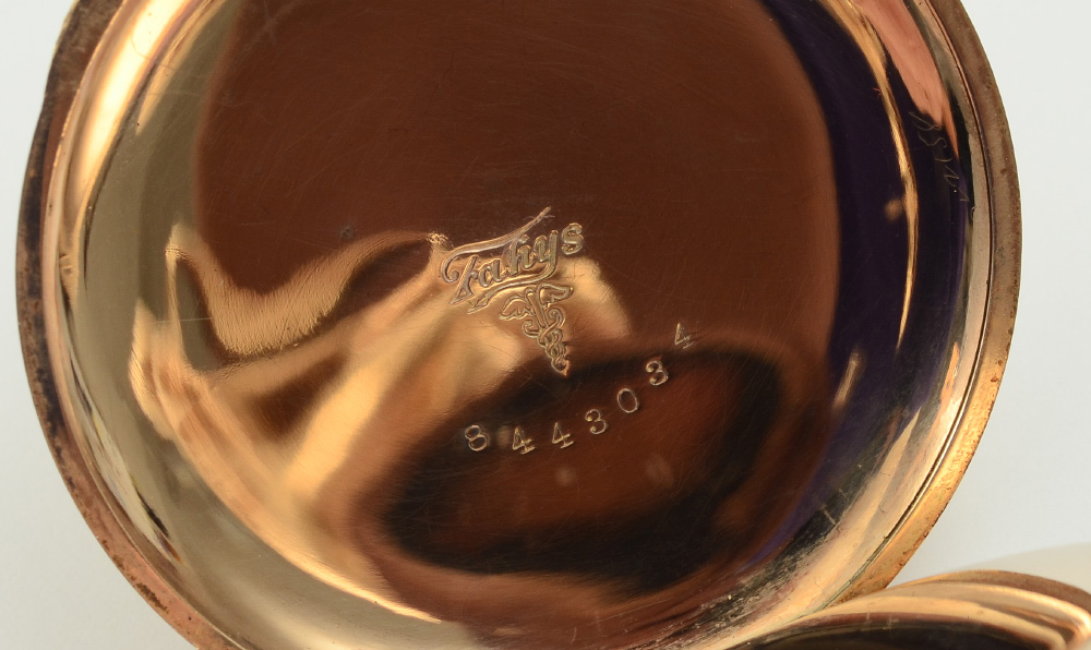 ILLINOIS WATCH CO SPRINGFIELD POCKET WATCH: In an ornate engraved Fahys case. 17 jewel movement in working order, secondary seconds dial, signed on the dial and the works, serial number 2752250. The hunter case is signed Fahys and has the caduceus and #8443034. Measures 1 3/4' dia. Sold with the chain and locket fob with photos.