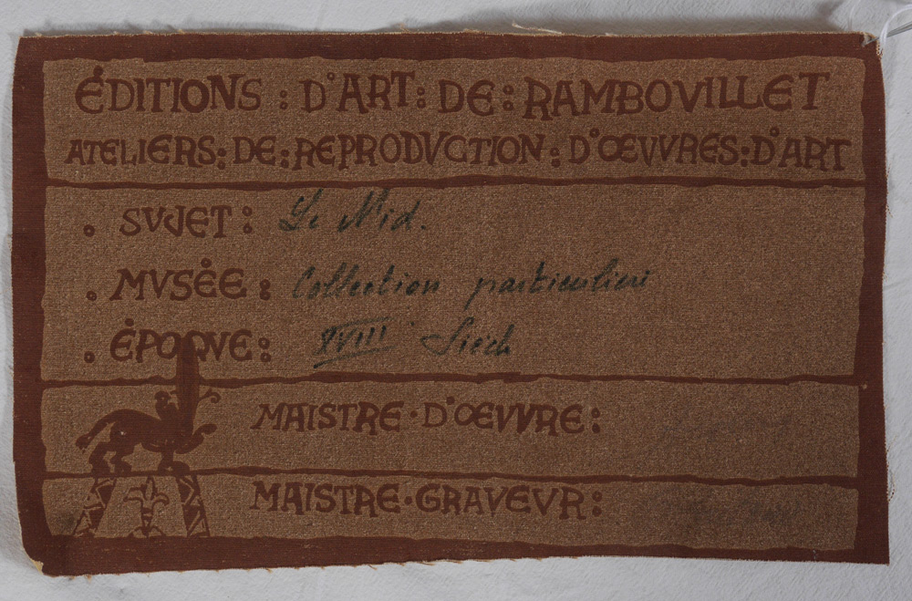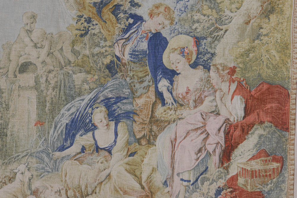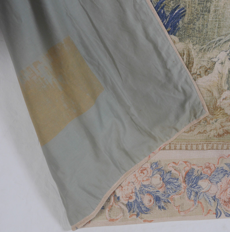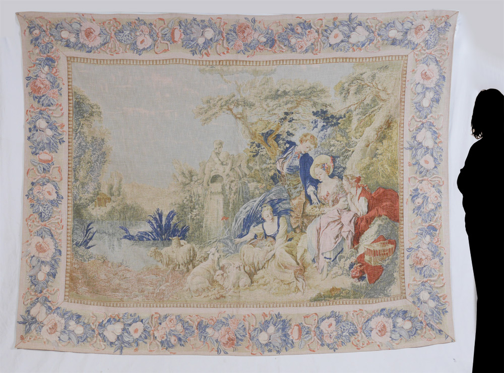 EDITIONS D'ART DE RAMBOVILLET TAPESTRY: Entitled Le Nid. 20th C reproduction silkscreen tapestry depicting romantic scene in the manner of Watteau. Measures approx. 8 ft. x 6 ft. Sold with a 1982 appraisal for donation $3,200.