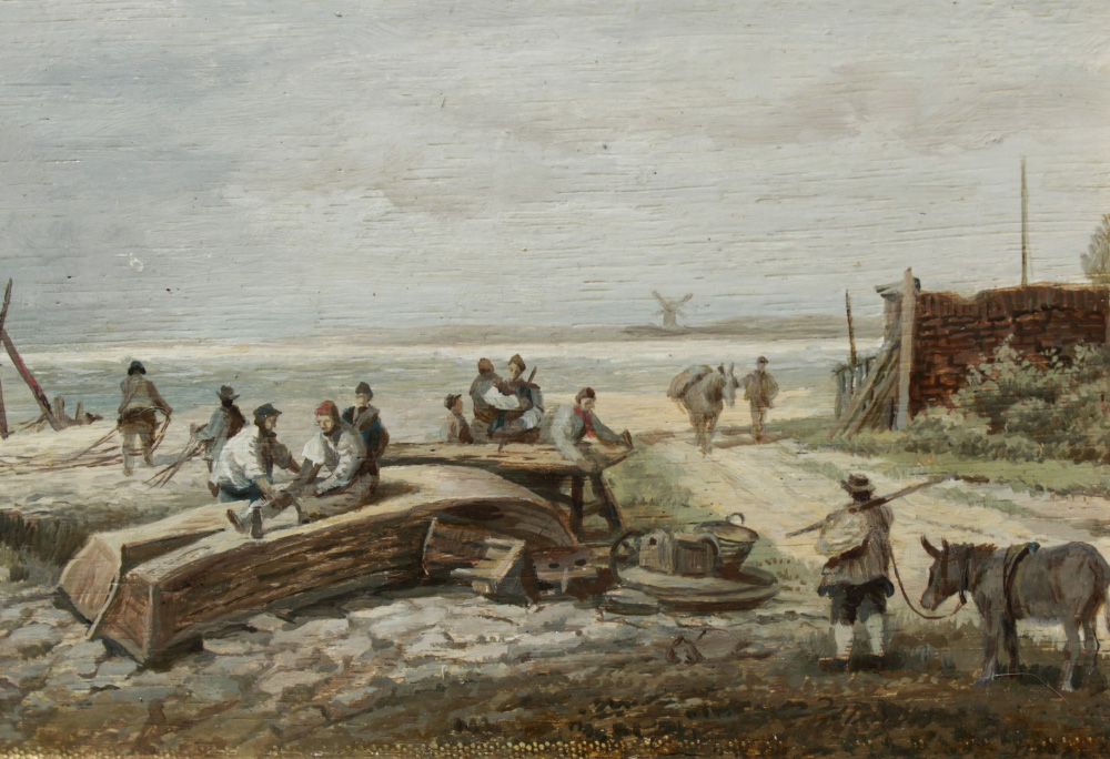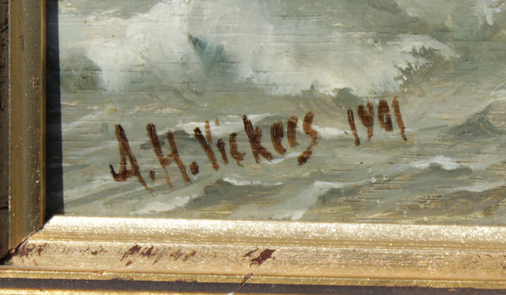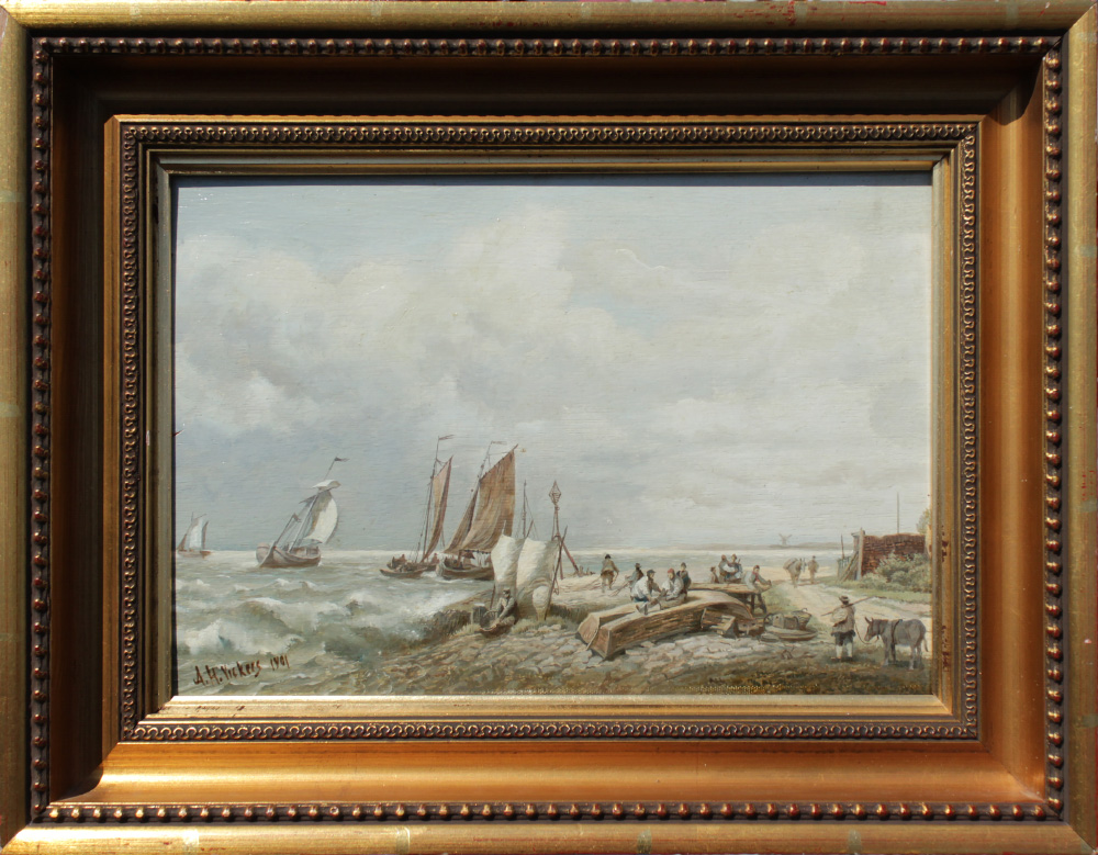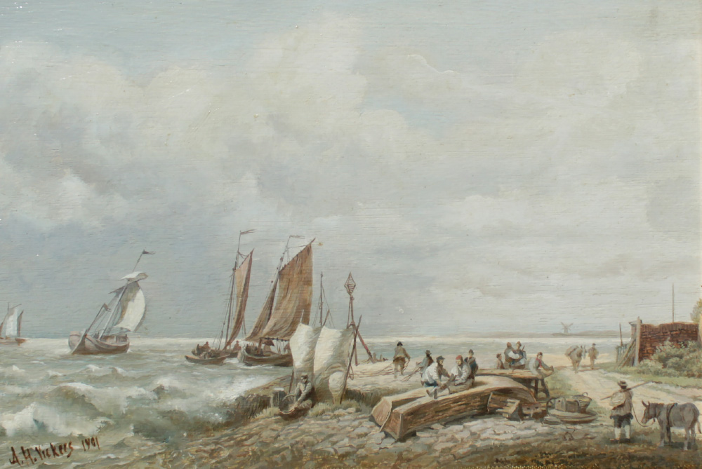 VICKERS, Alfred H., (British, 19th Century): Busy Harbor Shore with Fishermen and Boat Builders, Oil/Board, sight size 9'' x 13 1/8'', signed lower left and dated 1901, framed 13 1/2'' x 17 1/2''.