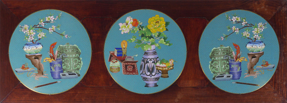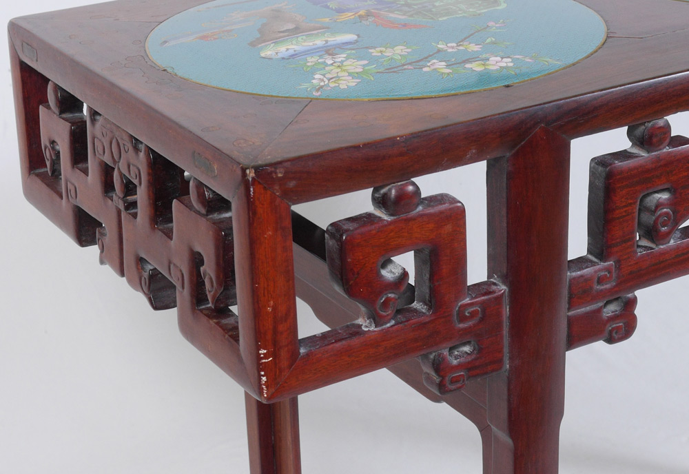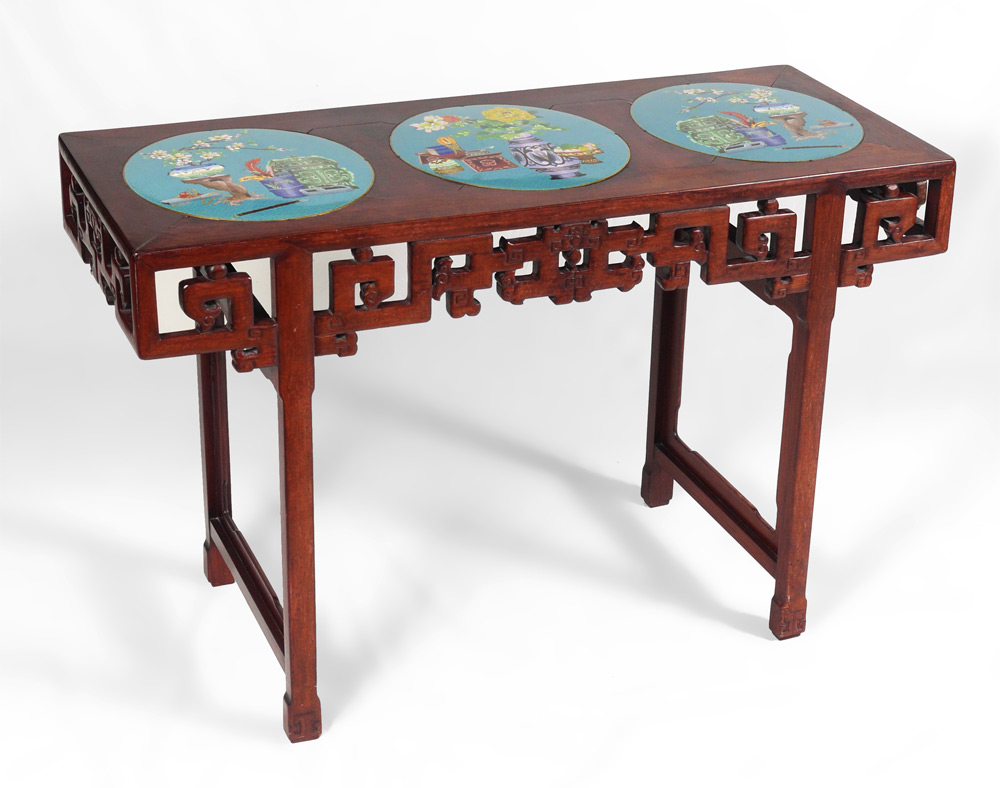 CARVED ALTAR STYLE SOFA TABLE WITH CLOISONNE INSERTS: Top with 3 cloisonne inset medallions depicting scholarly items, carved openwork skirt, shaped legs. 31 3/4'' h. x 46 1/2'' x 17''.