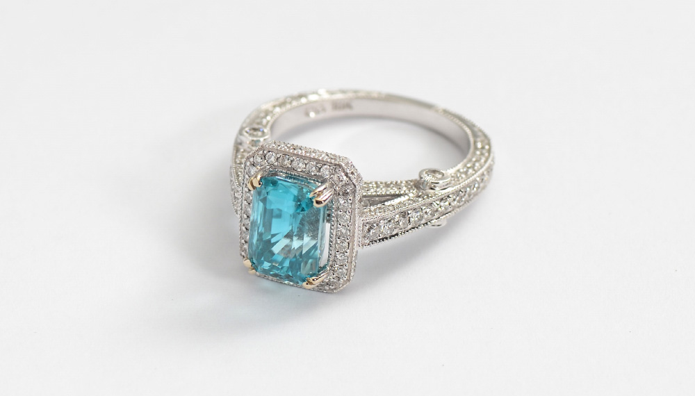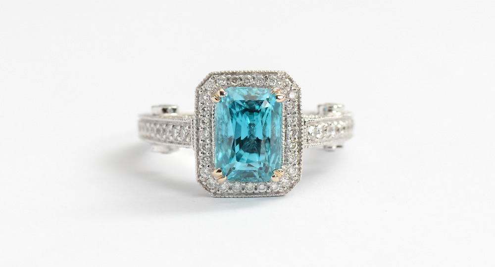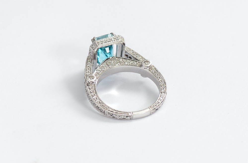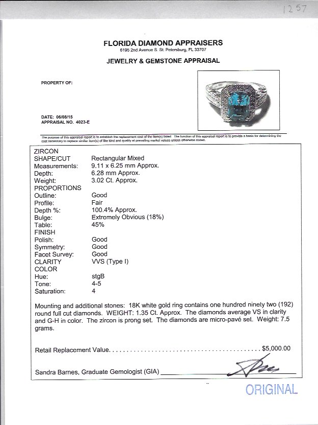 3 CT BLUE ZIRCON AND PAVE DIAMOND RING: 18k white gold ring centering an emerald cut blue zircon of approx. 3.02 Ct. In the micro pave setting and framing the Zircon are 192 round full cut diamonds totaling approx. 1.35 Ct., averaging VS clarity and G-H color. Size 6.5. Weight 7.5 grams. Sold with current Florida Diamond Appraisers GIA graduates appraisal for $5600.