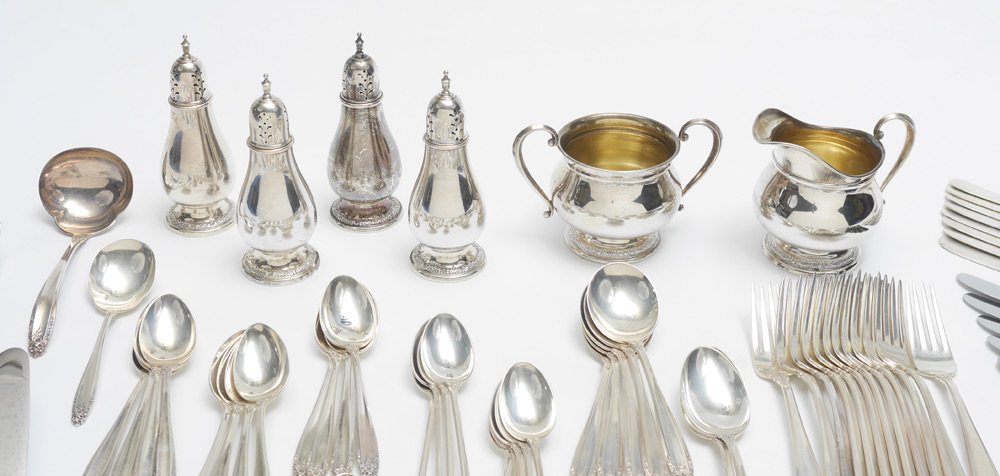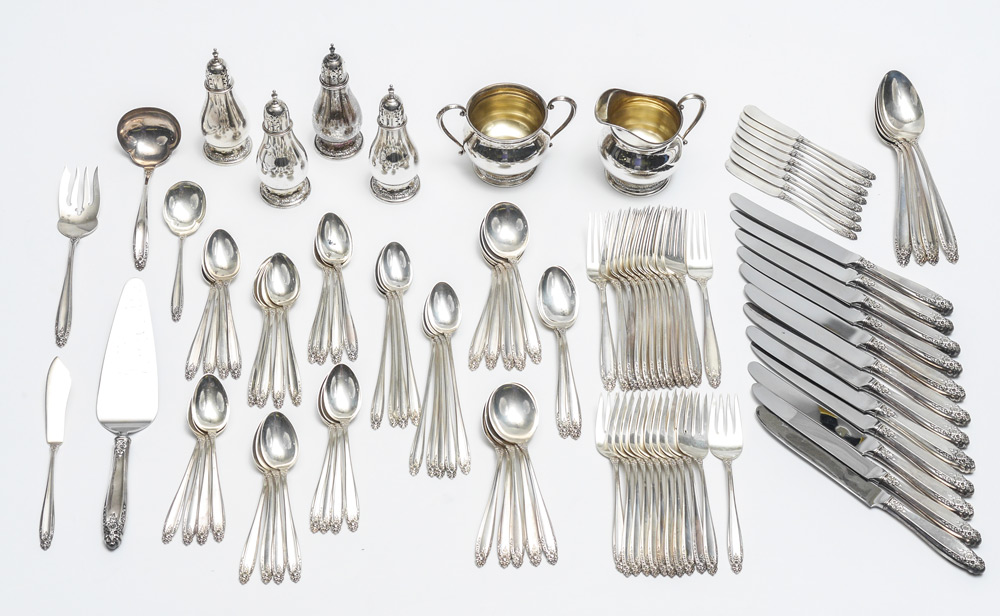 INTERNATIONAL PRELUDE STERLING SILVER FLATWARE: Approx. 105 pieces in the ''Prelude'' pattern by International Silver to include 12 forks (7 1/4''), 12 salad forks (6 5/8''), 24 teaspoons (6''), 10 soup spoons (6 1/2''), 2 spoons (6 3/4''), 9 iced teaspoons (7 3/8''), 12 hollow knives (9 1/8''), master butter knife (7 1/8''), 8 solid butter knives (5 3/4''), 4 tablespoons (8 1/2''), sugar scoop (5 7/8''), gravy ladle (6 5/8''), cold meat fork (7 3/4''), cocktail fork (5 7/8''), hollow pie server (10 1/8''). Sold with the matching cream (3 1/2'' h.) and sugar (3 1/4''), and 2 pairs of shakers (5''). Approx. 123.0 troy oz.