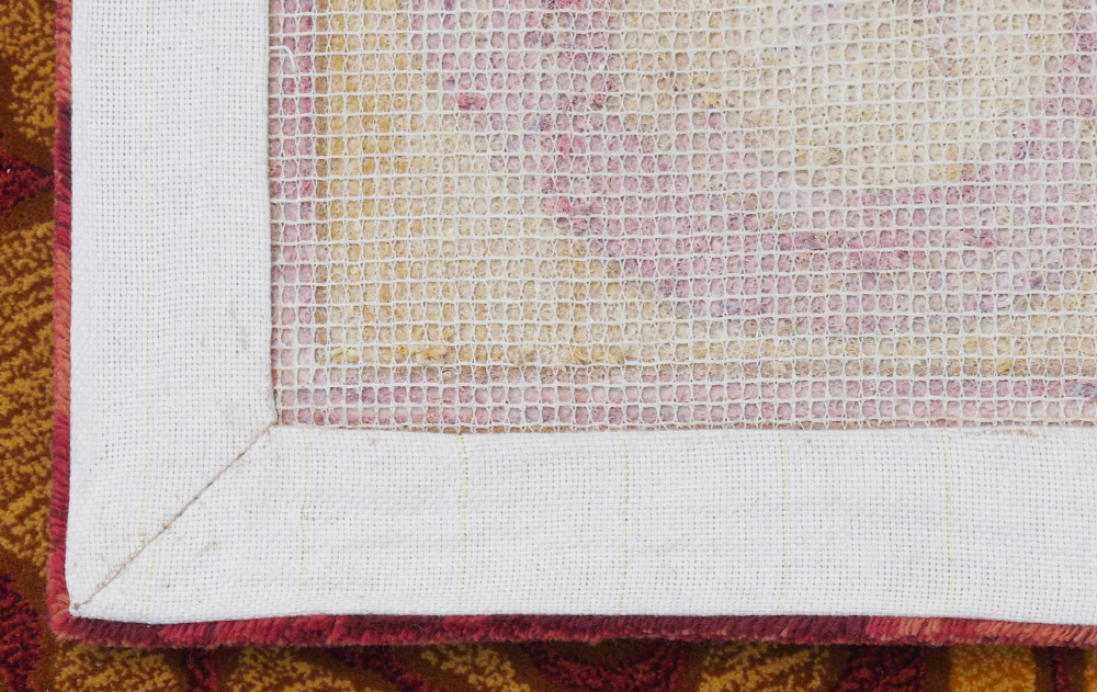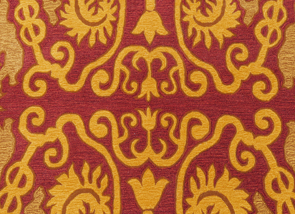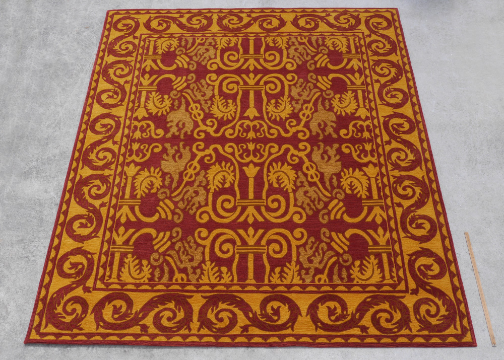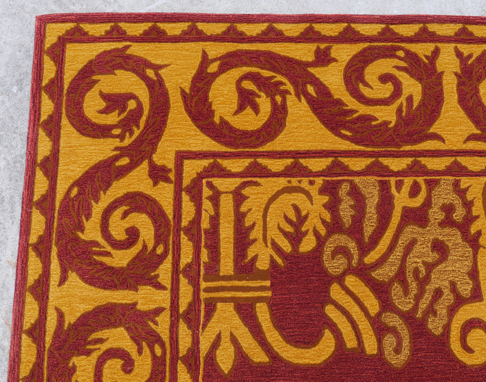 CUSTOM CONTEMPORARY WOOL CARPET, 9'11'' x 12'1'': Made in Thailand with the Wools of New Zealand, 6 color. Red ground with gold and golden brown design.