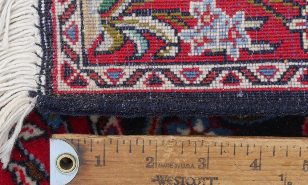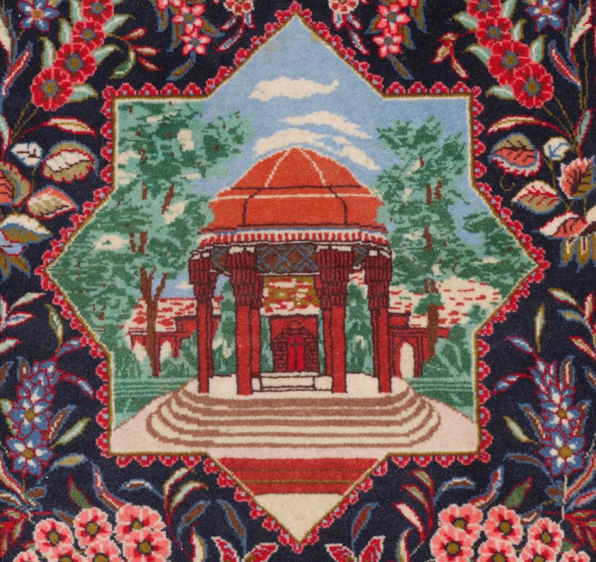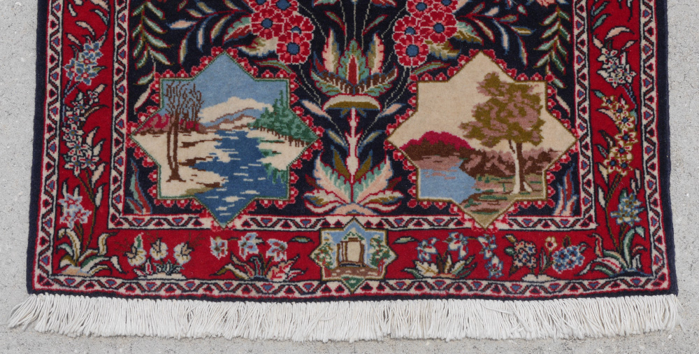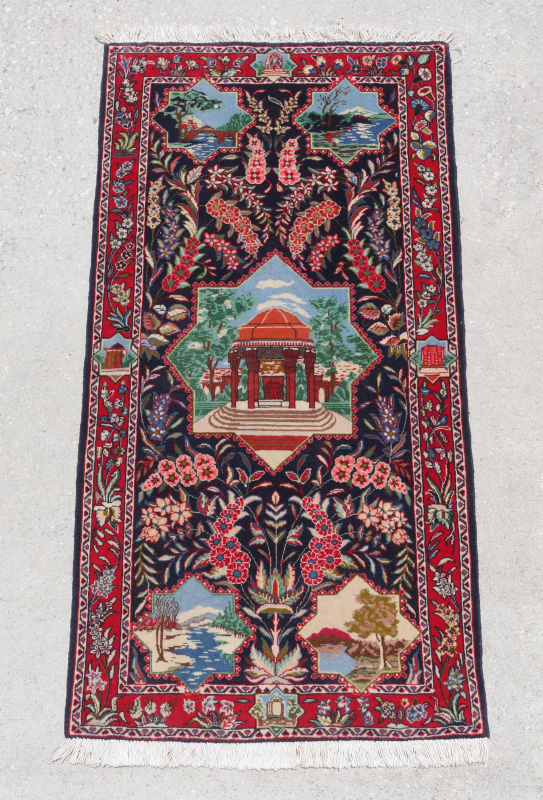 APPROX. 20-35 YR. OLD PERSIAN OR SINO-PERSIAN HAND KNOTTED WOOL RUG, 2'1'' x 4'1'': This rug is an unusual pictorial rug containing star shaped panels with various scenes. There are two panels at the top and bottom of the field and a larger one in the center of the rug. The central star has an ornate pavilion with other buildings in the distance. The other four pictures are of outdoor scenes that include water - a river or lake, trees, and mountains in the four seasons of the year. The rest of the field has a blue ground with typical sprays of flowers and leaves. The red ground main border has a continuous design of various flowers and four small star shaped pictorial panels. This is a pretty and unusual rug that would make a statement in any home. Condition is good.