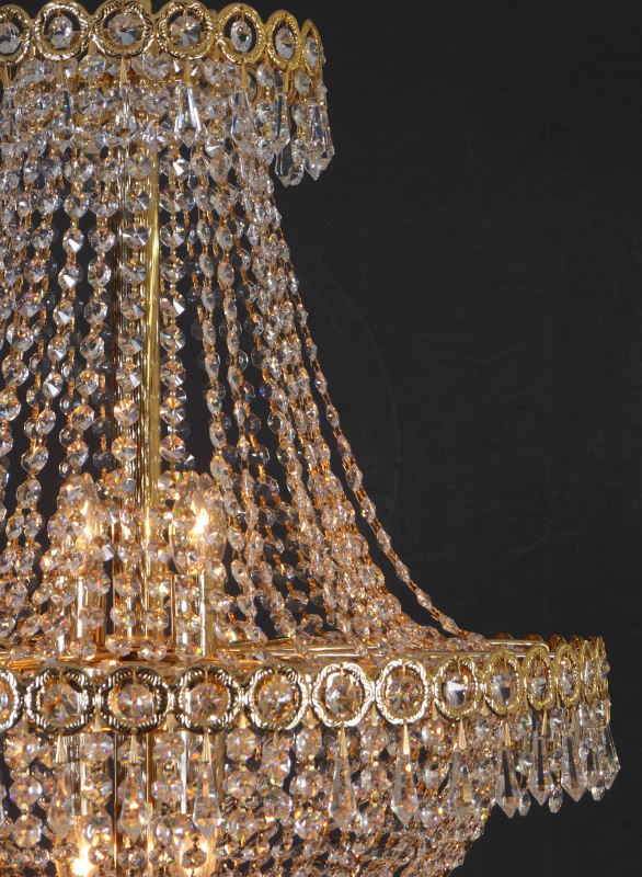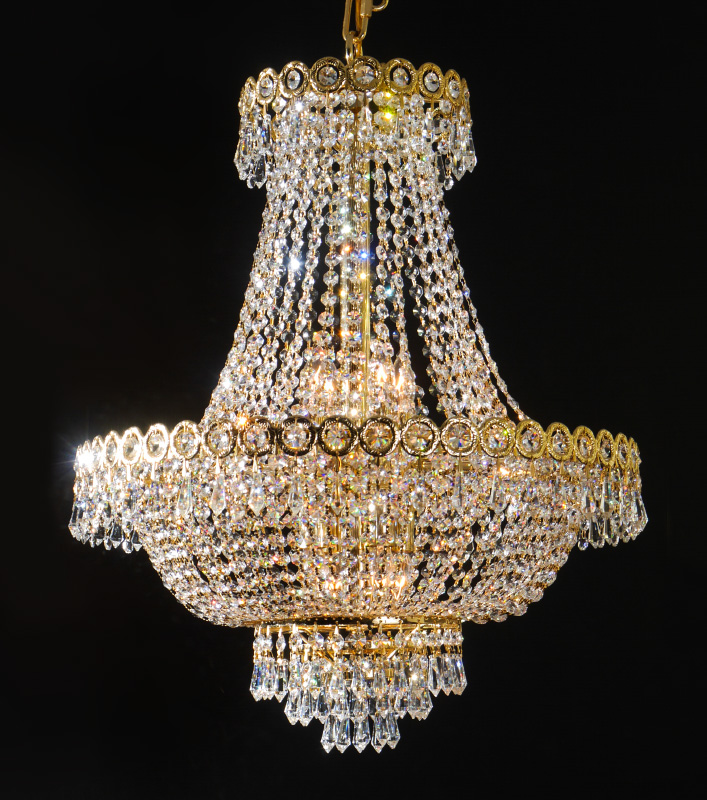 SWAROVSKI? CRYSTAL 12 LIGHT BRASS CHANDELIER: Brass frame with crystal prisms and drops. This model of chandelier could be ordered with Swarovski crystals. Approx. 27'' h. x 20 1/2'' dia.