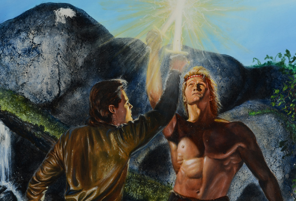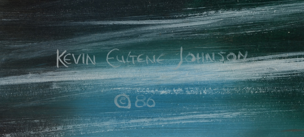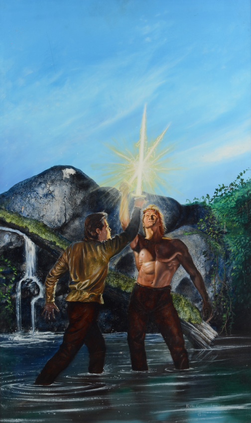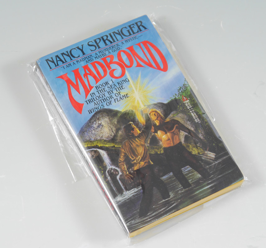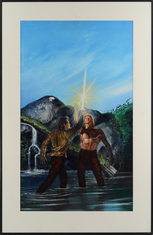 JOHNSON, Kevin Eugene, (American, 1954-): Cover art for ''Madbond'' by Nancy Springer, Painting, sight size 29 1/2'' x 17 1/2'', signed lower right and dated '80, contemporary metal frame, 36 1/2'' x 24'', sold with paperback copy of book.