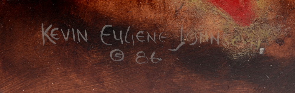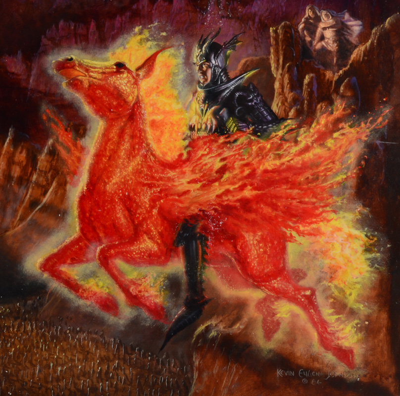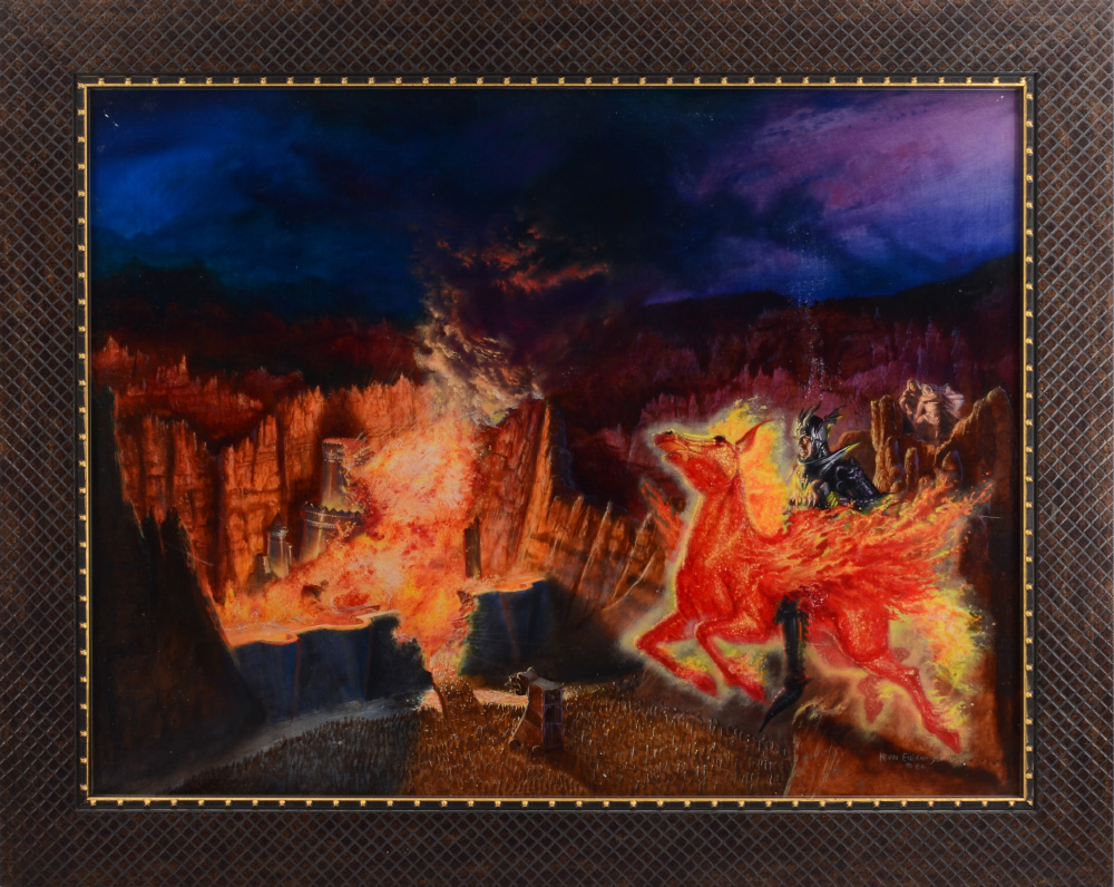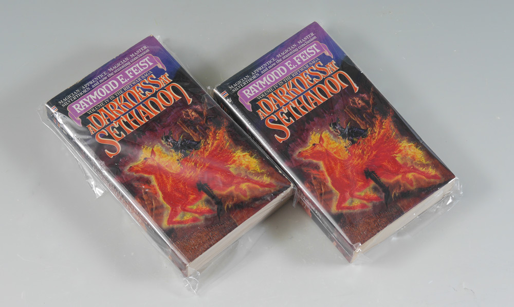 JOHNSON, Kevin Eugene, (American, 1954-): Cover art for ''A Darkness at Sehanon'' by Raymond E. Feist, Painting, sight size 23 1/2'' x 30 3/4'', signed lower right and dated '86, fine contemporary frame, 29 1/2'' x 37'', sold with two paperback copies of the book.